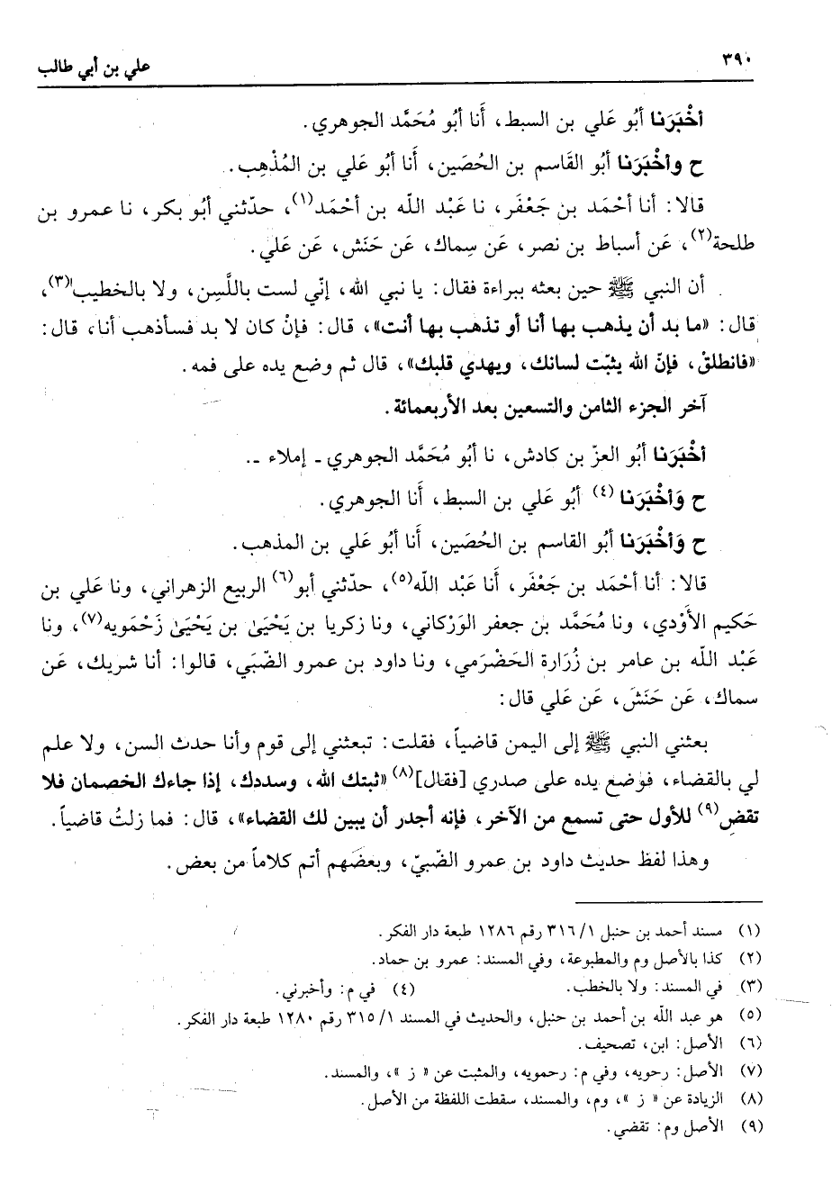 أخبرنا أبو علي بن السبط أنا أبو محمد الجوهري ح وأخبرنا أبو القاسم بن الحصين أنا أبو علي بن المذهب قالا أنا أحمد بن جعفر نا عبد الله بن أحمد (1) حدثني أبو بكر نا عمرو بن طلحة (2) عن أسباط بن نصر عن سماك عن حنش عن علي أن النبي (صلى الله عليه وسلم) حين بعثه ببراءة فقال يا نبي الله إني لست باللسن ولا بالخطيب (3) قال ما بد أن يذهب بها أنا أو تذهب بها أنت قال فإن كان لابد فسأذهب أنا قال فانطلق فإن الله يثبت لسانك ويهدي قلبك قال ثم وضع يده على فمه اخر الجزء الثامن والتسعين بعد الأربعمائة أخبرنا أبو العز بن كادش نا أبو محمد الجوهري إملاء ح وأخبرنا (4) أبو علي بن السبط أنا الجوهري واخبرنا أبو القاسم بن الحصين أنا أبو علي بن المذهب قالا أنا أحمد بن جعفر أنا عبد الله (5) حدثني أبو (6) الربيع الزهراني ونا علي بن حكيم الأودي ونا محمد بن جعفر الوركاني ونا زكريا بن يحيى بن يحيى زحمويه (7) ونا عبد الله بن عامر بن زرارة الحضرمي ونا داود بن عمرو الضبي قالوا أنا شريك عن سماك عن حنش عن علي قال بعثني النبي (صلى الله عليه وسلم) إلى اليمن قاضيا فقلت تبعثني إلى قوم وأنا حدث السن ولا علم لي بالقضاء فوضع يده على صدري فقال (8) ثبتك الله وسددك إذ جاءك الخصمان فلا تقض (9) للأول حتى تسمع من الاخر فإنه أجدر أن يبين لك القضاء قال فما زلت قاضيا وهذا لفظ حديث داود بن عمرو الضبي وبعضهم أتم كلاما من بعض