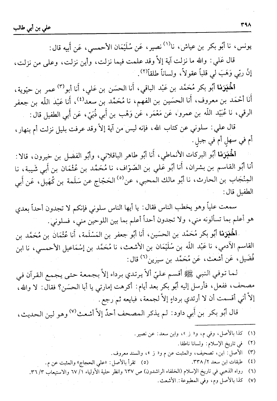 يونس نا أبو بكر بن عياش نا (1) نصير عن سليمان الأحمسي عن أبيه قال قال علي والله ما نزلت اية إلا وقد علمت فيما نزلت وأين نزلت وعلى من نزلت إن ربي وهب لي قلبا عقولا ولسانا طلقا (2) أخبرنا أبو بكر محمد بن عبد الباقي أنا الحسن بن علي أنا أبو (3) عمر بن حيوية أنا أحمد بن معروف أنا الحسين بن الفهم نا محمد بن سعد (4) أنا عبد الله بن جعفر الرقي نا عبيد الله بن عمرو عن معمر عن وهب بن أبي ذبي عن أبي الطفيل قال قال علي سلوني عن كتاب الله فإنه ليس من اية إلا وقد عرفت بليل نزلت أم بنهار أم في سهل أم في جبل أخبرنا أبو البركات الأنماطي أنا أبو طاهر الباقلاني وأبو الفضل بن خيرون قالا أنا أبو القاسم بن بشران أنا أبو علي بن الصواف نا محمد بن عثمان بن أبي شيبة نا المنجاب بن الحارث نا أبو مالك المحبي عن الحجاج عن سلمة بن كهيل عن أبي الطفيل قال سمعت عليا وهو يخطب الناس فقال يا أيها الناس سلوني فإنكم لا تجدون أحدا بعدي هو أعلم بما تسألوني مني ولا تجدون أحدا أعلم بما بين اللوحين مني فسلوني أخبرنا أبو بكر محمد بن الحسين أنا أبو جعفر بن المسلمة أنا عثمان بن محمد بن القاسم الادمي نا عبد الله بن سليمان بن الأشعث نا محمد بن إسماعيل الأحمسي نا ابن فضيل عن أشعث عن محمد بن سيرين (6) قال لما توفي النبي (صلى الله عليه وسلم) أقسم علي ألا يرتدي برداء إلا بجمعة حتى يجمع القران في مصحف ففعل فأرسل إليه أبو بكر بعد أيام أكرهت إمارتي يا أبا الحسن فقال لا والله إلا أني أقسمت أن لا أرتدي برداء إلا لجمعة فبايعه ثم رجع قال أبو بكر بن أبي داود لم يذكر المصحف أحد إلا أشعث (7) وهو لين الحديث