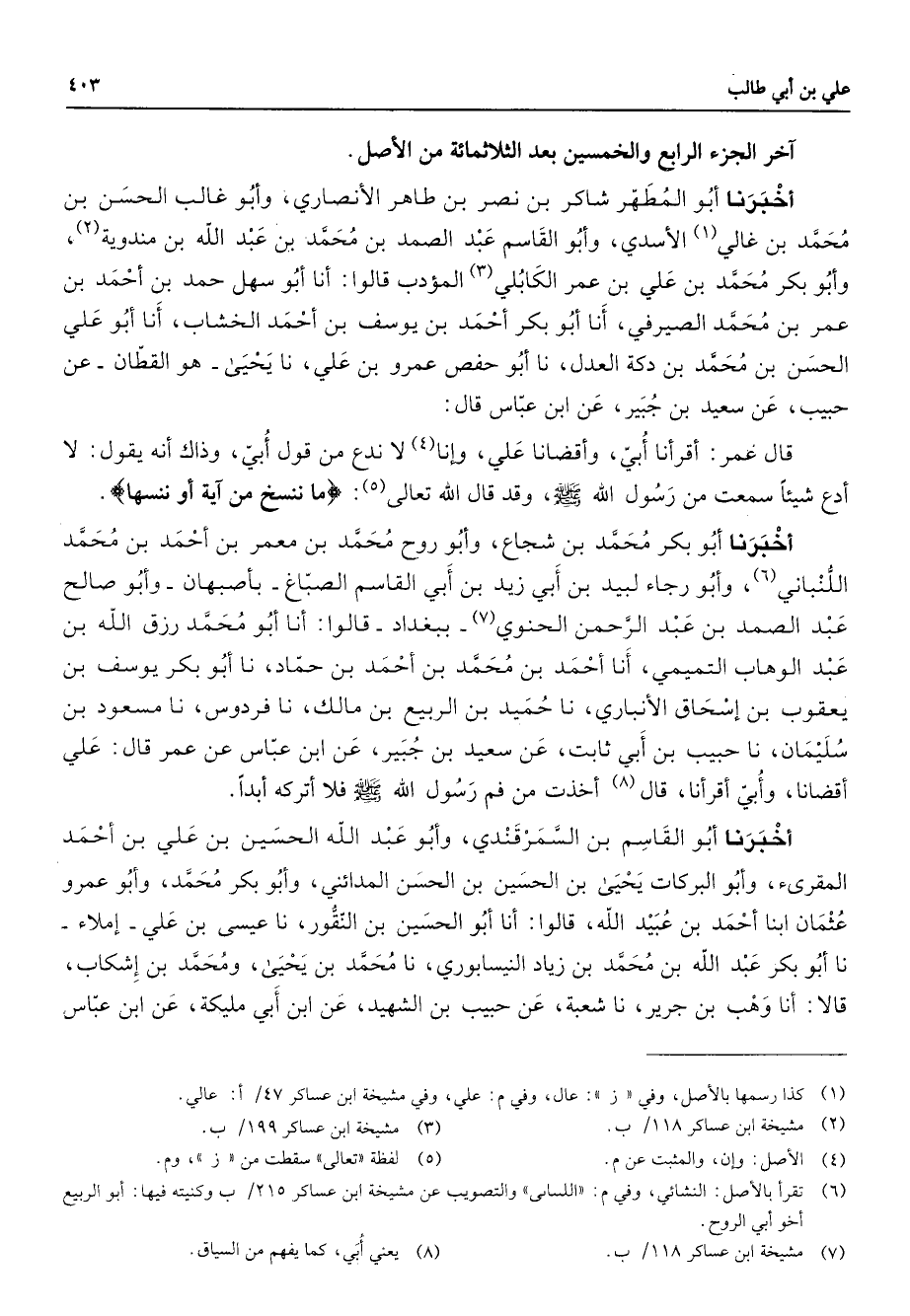 اخر الجزء الرابع والخمسين بعد الثلاثمائة من الأصل أخبرنا أبو المطهر شاكر بن نصر بن طاهر الأنصاري وأبو غالب الحسن بن محمد بن غالي (1) الأسدي وأبو القاسم عبد الصمد بن محمد بن عبد الله بن مندوية (2) وأبو بكر محمد بن علي بن عمر الكابلي (3) المؤدب قالوا أنا أبو سهل حمد بن أحمد بن عمر بن محمد الصيرفي أنا أبو بكر أحمد بن يوسف بن أحمد الخشاب أنا أبو علي الحسن بن محمد بن دكة العدل نا أبو حفص عمرو بن علي نا يحيى هو القطان عن حبيب عن سعيد بن جبير عن ابن عباس قال قال عمر أقرأنا أبي وأقضانا علي وإنا (4) لا ندع من قول أبي وذاك أنه يقول لا أدع شيئا سمعت من رسول الله (صلى الله عليه وسلم) وقد قال الله تعالى " (5) ما ننسخ من اية أو ننسها " أخبرنا أبو بكر محمد بن شجاع وأبو روح محمد بن معمر بن أحمد بن محمد اللنباني (6) وأبو رجاء لبيد بن أبي زيد بن أبي القاسم الصباغ بأصبهان وأبو صالح عبد الصمد بن عبد الرحمن الحنوي (7) ببغداد قالوا أنا أبو محمد رزق الله بن عبد الوهاب التميمي أنا أحمد بن محمد بن أحمد بن حماد نا أبو بكر بوسف بن يعقوب بن إسحاق الأنباري نا حميد بن الربيع بن مالك نا فردوس نا مسعود بن سليمان نا حبيب بن أبي ثابت عن سعيد بن جبير عن ابن عباس عن عمر قال علي أقضانا وأبي أقرأنا قال أخذت (8) من فم رسول الله (صلى الله عليه وسلم) فلا أتركه أبدا أخبرنا أبو القاسم بن السمرقندي وأبو عبد الله الحسين بن علي بن أحمد المقرئ وأبو البركات يحيى بن الحسين بن الحسن المدائني وأبو بكر محمد وأبو عمرو عثمان ابنا أحمد بن عبيد الله قالوا أنا أبو الحسين بن النقور نا عيسى بن علي إملاء نا أبو بكر عبد الله بن محمد بن زياد النيسابوري نا محمد بن يحيى ومحمد بن إشكاب قالا أنا وهب بن جرير نا شعبة عن حبيب بن الشهيد عن ابن أبي مليكة عن ابن عباس