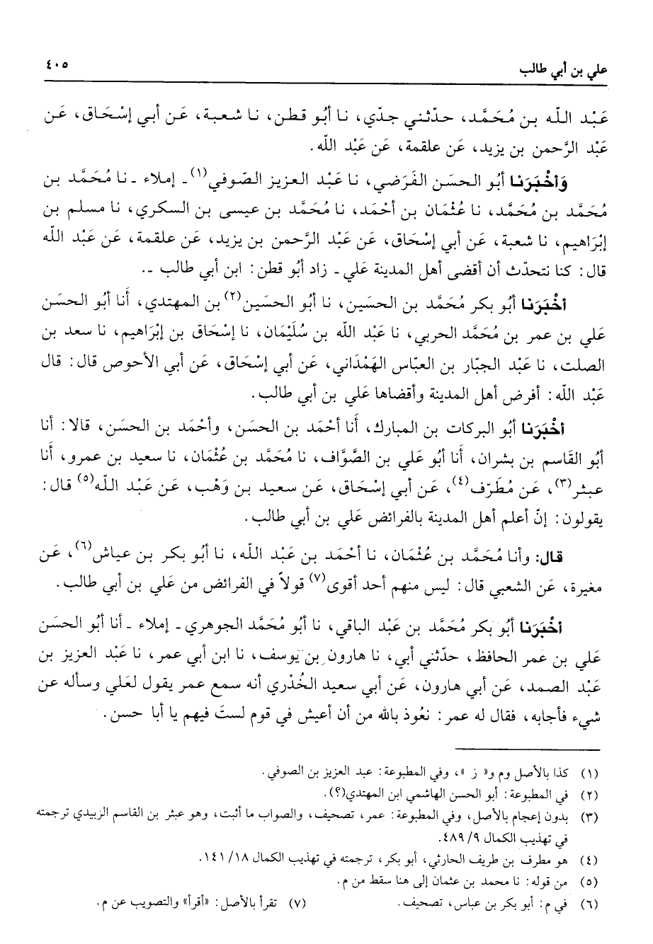 عبد الله بن محمد حدثني جدي نا أبو قطن نا أبو قطن نا شعبة عن أبي إسحاق عن عبد الرحمن بن يزيد عن علقمة عن عبد الله وأخبرنا أبو الحسن الفرضي نا عبد العزيز الصوفي (1) إملاء نا محمد بن محمد بن محمد نا عثمان بن أحمد نا محمد بن عيسى بن السكري نا مسلم بن إبراهيم نا شعبة عن أبي إسحاق عن عبد الرحمن بن يزيد عن علقمة عن عبد الله قال كنا نتحدث أن أقضى أهل المدينة علي زاد أبو قطن ابن أبي طالب أخبرنا أبو بكر محمد بن الحسين نا أبو الحسين (2) بن المهتدي أنا أبو الحسن علي بن عمر بن محمد الحربي نا عبد الله بن سليمان نا إسحاق بن إبراهيم نا سعد بن الصلت نا عبد الجبار بن العباس الهمداني عن أبي إسحاق عن أبي الأحوص قال قال عبد الله أفرض أهل المدينة وأقضاها علي بن أبي طالب أخبرنا أبو البركات بن المبارك أنا أحمد بن الحسن وأحمد بن الحسن قالا أنا أبو القاسم بن بشران أنا أبو علي بن الصواف نا محمد بن عثمان نا سعيد بن عمرو أنا عبثر (3) عن مطرف (4) عن أبي إسحاق عن سعيد بن وهب عن عبد الله (5) قال يقولون إن أعلم أهل المدينة بالفرائض علي بن أبي طالب قال وأنا محمد بن عثمان نا أحمد بن عبد الله نا أبو بكر بن عياش (6) عن مغيرة عن الشعبي قال ليس منهم أحد أقوى (7) قولا في الفرائض من علي بن أبي طالب أخبرنا أبو بكر محمد بن عبد الباقي نا أبو محمد الجوهري أملاء أنا أبو الحسن علي بن عمر الحافظ حدثني أبي نا هارون بن يوسف نا ابن أبي عمر نا عبد العزيز بن عبد الصمد عن أبي هارون عن أبي سعيد الخدري أنه سمع عمر يقول لعلي وسأله عن شئ فأجابه فقال له عمر نعوذ بالله من أن أعيش في قوم لست فيهم يا أبا حسن