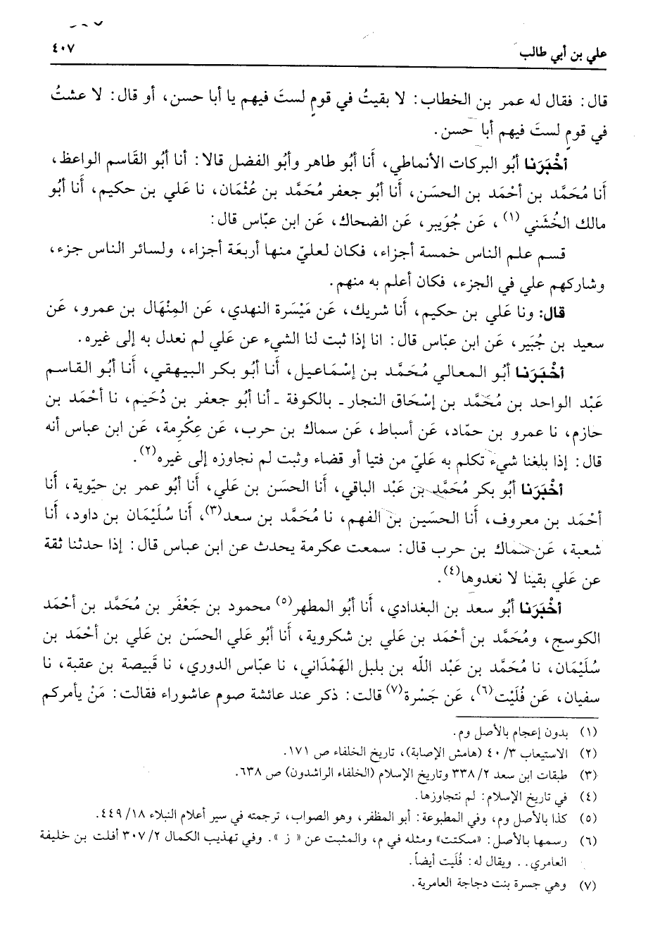قال فقال له عمر بن الخطاب لا بقيت في قوم لست فيهم يا أبا حسن أو قال لا عشت في قوم لست فيهم أبا حسن أخبرنا أبو البركات الأنماطي أنا أبو طاهر وأبو الفضل قالا أنا أبو القاسم الواعظ أنا محمد بن أحمد بن الحسن أنا أبو جعفر محمد بن عثمان نا علي بن حكيم أنا أبو مالك الخشني (1) عن جويبر عن الضحاك عن ابن عباس قال قسم علم الناس خمسة أجزاء فكان لعلي منها أربعة أجزاء ولسائر الناس جزء وشاركهم علي في الجزء فكان أعلم به منهم قال ونا علي بن حكيم أنا شريك عن ميسرة النهدي عن المنهال بن عمرو عن سعيد بن جبير عن ابن عباس قال انا إذا ثبت لنا الشئ عن علي لم نعدل به إلى غيره أخبرنا أبو المعالي محمد بن إسماعيل أنا أبو بكر البيهقي أنا أبو القاسم عبد الواحد بن محمد بن إسحاق النجار بالكوفة أنا أبو جعفر بن دحيم نا أحمد بن حازم نا عمرو بن حماد عن أسباط عن سماك بن حرب عن عكرمة عن ابن عباس أنه قال إذا بلغنا شئ تكلم به علي من فتيا أو قضاء وثبت لم نجاوزه إلى غيره (2) أخبرنا أبو بكر محمد بن عبد الباقي أنا الحسن بن علي أنا أبو عمر بن حيوية أنا أحمد بن معروف أنا الحسين بن الفهم نا محمد بن سعد (3) أنا سليمان بن داود أنا شعبة عن سماك بن حرب قال سمعت عكرمة يحدث عن ابن عباس قال إذا حدثنا ثقة عن علي بقينا لا نعدوها (4) أخبرنا أبو سعد بن البغدادي أنا أبو المطهر (5) محمود بن جعفر بن محمد بن أحمد الكوسج ومحمد بن أحمد بن علي بن شكروية أنا أبو علي الحسن بن علي بن احمد بن سليمان نا محمد بن عبد الله بن بلبل الهمداني نا عباس الدوري نا قبيصة بن عقبة نا سفيان عن فليت (6) عن جسرة (7) قالت ذكر عند عائشة صوم عاشوراء فقالت من يأمركم