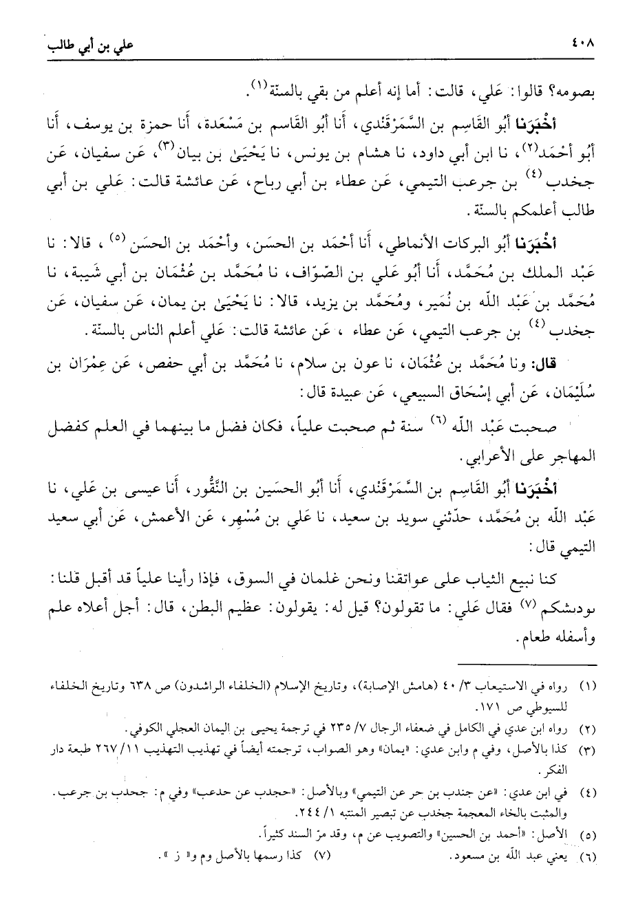بصومه قالوا علي قالت أما إنه أعلم من بقي بالسنة (1) اخبرنا أبو القاسم بن السمرقندي أنا أبو القاسم بن مسعدة أنا حمزة بن يوسف أنا أبو أحمد (2) نا ابن أبي داود نا هشام بن يونس نا يحيى بن بيان (3) عن سفيان عن جخدب (4) بن جرعب التيمي عن عطاء بن أبي رباح عن عائشة قالت علي بن أبي طالب أعلمكم بالسنة أخبرنا أبو البركات الأنماطي أنا أحمد بن الحسن وأحمد بن الحسن (5) قالا نا عبد الملك بن محمد أنا أبو علي بن الصواف نا محمد بن عثمان بن أبي شيبة نا محمد بن عبد الله بن نمير ومحمد بن يزيد قالا نا يحيى بن يمان عن سفيان عن جخدب (4) بن جرعب التيمي عن عطاء عن عائشة قالت علي أعلم الناس بالسنة قال ونا محمد بن عثمان نا عون بن سلام نا محمد بن أبي حفص عن عمران بن سليمان عن أبي إسحاق السبيعي عن عبيدة قال صحبت عبد الله (6) سنة ثم صحبت عليا فكان فضل ما بينهما في العلم كفضل المهاجر على الأعرابي أخبرنا أبو القاسم بن السمرقندي أنا أبو الحسين بن النقور أنا عيسى بن علي نا عبد الله بن محمد حدثني سويد بن سعيد نا علي بن مسهر عن الأعمش عن أبي سعيد التيمي قال كنا نبيع الثياب على عواتقنا ونحن غلمان في السوق فإذا رأينا عليا قد أقبل قلنا بودشكم (7) فقال علي ما تقولون قيل له يقولون عظيم البطن قال أجل أعلاه علم وأسفله طعام