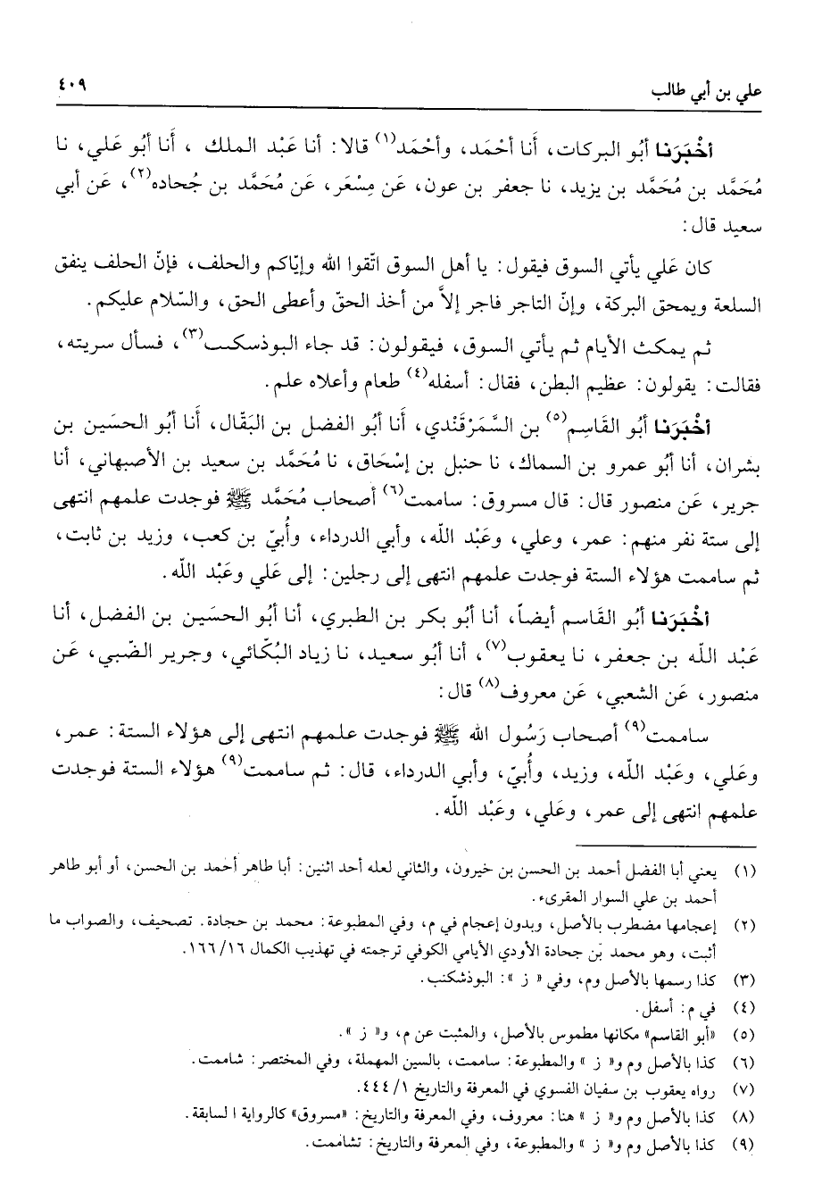 أخبرنا أبو البركات أنا أحمد وأحمد (1) قالا أنا عبد الملك أنا أبو علي نا محمد بن محمد بن يزيد نا جعفر بن عون عن مسعر عن محمد بن جحاده (2) عن أبي سعيد قال كان علي يأتي السوق فيقول يا أهل السوق اتقوا الله وإياكم والحلف فإن الحلف ينفق السلعة ويمحق البركة وإن التاجر فاجر إلا من أخذ الحق وأعطى الحق والسلام عليكم ثم يمكث الأيام ثم يأتي السوق فيقولون قد جاء البوذسكب (3) فسأل سريته فقالت يقولون عظيم البطن فقال أسفله (4) طعام وأعلاه علم أخبرنا أبو القاسم (5) بن السمرقندي أنا أبو الفضل بن البقال أنا أبو الحسين بن بشران أنا أبو عمرو بن السماك نا حنبل بن إسحاق نا محمد بن سعيد بن الأصبهاني أنا جرير عن منصور قال قال مسروق ساممت (6) أصحاب محمد (صلى الله عليه وسلم) فوجدت علمهم انتهى إلى سنة نفر منهم عمر وعلي وعبد الله وأبي الدرداء وأبي بن كعب وزيد بن ثابت ثم ساممت هؤلاء الستة فوجدت علمهم انتهى إلى رجلين إلى علي وعبد الله أخبرنا أبو القاسم أيضا أنا أبو بكر بن الطبري أنا أبو الحسين بن الفضل أنا عبد الله بن جعفر نا يعقوب (7) أنا أبو سعيد نا زياد البكائي وجرير الضبي عن منصور عن الشعبي عن معروف (8) قال ساممت (9) أصحاب رسول الله (صلى الله عليه وسلم) فوجدت علمهم انتهى إلى هؤلاء الستة عمر وعلي وعبد الله وزيد وأبي وأبي الدرداء قال ثم ساممت (9) هؤلاء الستة فوجدت علمهم انتهى إلى عمر وعلي وعبد الله