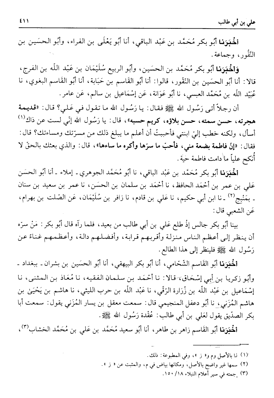 أخبرنا أبو بكر محمد بن عبد الباقي أنا أبو يعلى بن الفراء وأبو الحسين بن النقور وجماعة وأخبرنا أبو بكر محمد بن الحسين وأبو الربيع سليمان بن عبد الله بن الفرج قالا أنا أبو الحسين بن النقور قالوا أنا أبو القاسم بن حبابة أنا أبو القاسم البغوي نا عبيد الله بن محمد العبسي نا أبو عوانة عن إسماعيل بن سالم عن عامر أن رجلا أتى رسول الله (صلى الله عليه وسلم) فقال يا رسول الله ما تقول في علي قال قديمة هجرته حسن سمته حسن بلاؤه كريم حسبه قال يا رسول الله إني لست عن ذاك (1) أسأل ولكنه خطب إلي ابنتي فأحببت أن أعلم ما يبلغ ذلك من مسرتك ومساءتك قال فقال إن فاطمة بضعة مني فأحب ما سرها وأكره ما ساءها قال والذي بعثك بالحق لا أنكح عليا ما دامت فاطمة حية أخبرنا أبو بكر محمد بن عبد الباقي نا أبو محمد الجوهري إملاء أنا أبو الحسن علي بن عمر بن أحمد الحافظ نا أحمد بن سلمان بن الحسن نا عمر بن سعيد بن سنان بمنبج (2) نا ابن أبي حكيم نا علي بن قادم نا زافر بن سليمان عن الصلت بن بهرام عن الشعبي قال بينا أبو بكر جالس إذ طلع علي بن أبي طالب من بعيد فلما راه قال أبو بكر من سره أن ينظر إلى أعظم الناس منزلة وأقربهم قرابة وأفضلهم دالة وأعظمهم غناء عن رسول الله (صلى الله عليه وسلم) فلينظر إلى هذا الطالع أخبرنا أبو القاسم الشحامي أنا أبو بكر البيهقي أنا أبو الحسين بن بشران ببغداد وأبو زكريا بن أبي إسحاق قالا نا أحمد بن سلمان الفقيه نا معاذ بن المثنى نا إسماعيل بن عبد الله بن زرارة الرقي نا عبد الله بن حرب الليثي نا هاشم بن يحيى بن هاشم المزني نا أبو دعفل المنجيمي قال سمعت معقل بن يسار المزني يقول سمعت أبا بكر الصديق يقول لعلي بن أبي طالب عقدة رسول الله (صلى الله عليه وسلم) أخبرنا أبو القاسم زاهر بن طاهر أنا أبو سعيد محمد بن علي بن محمد الخشاب (3)