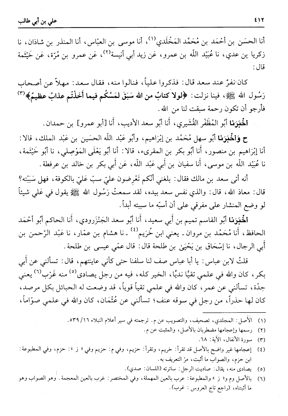 أنا الحسن بن أحمد بن محمد المخلدي (1) أنا موسى بن العباس أنا المنذر بن شاذان زكريا بن عدي نا عبيد الله بن عمرو عن زيد أبي أنيسة (2) عن عمرو بن مرة عن خيثمة قال كان نفر عند سعد قال فذكروا عليا فنالوا منه فقال سعد مهلا عن أصحاب رسول الله (صلى الله عليه وسلم) فينا نزلت " لولا كتاب من الله سبق لمسكم فيما أخذتم عذاب عظيم " (2) فأرجو أن تكون رحمة سبقت لنا من الله أخبرنا أبو المظفر القشيري أنا أبو سعد الأديب أنا أبو عمرو بن حمدان ح وأخبرنا أبو سهل محمد بن إبراهيم وأبو عبد الله الحسين بن عبد الملك قالا أنا إبراهيم بن منصور أنا أبو بكر بن المقرئ قالا أنا أبو يعلى الموصلي نا أبو خيثمة نا عبيد الله بن موسى أنا سفيان بن أبي عبد الله عن أبي بكر بن خالد بن عرفطة أنه أتى سعد بن مالك فقال بلغني أنكم تعرضون علي سب علي بالكوفة فهل سببته قال معاذ الله قال والذي نفس سعد بيده لقد سمعت رسول الله (صلى الله عليه وسلم) يقول في علي شيئا لو وضع المنشار على مفرقي على أن أسبه ما سببته أبدا أخبرنا أبو القاسم تميم بن أبي سعيد أنا أبو سعد الجنزرودي أنا الحاكم أبو أحمد الحافظ أنا محمد بن مروان يعني ابن خريم (4) نا هشام بن عمار نا عبد الرحمن بن أبي الرجال نا إسحاق بن يحيى بن طلحة قال قال عمي عيسى بن طلحة قلت لابن عباس يا أبا عباس صف لنا سلفنا حتى كأني عاينتهم قال تسألني عن أبي بكر كان والله في علمي تقيا نديا الخير كله فيه من رجل يصادى (5) منه غرب (6) يعني حده تسألني عن عمر كان والله في علمي تقيا قويا قد وضعت له الحبائل بكل مرصد كان لها حذرا من رجل في سوقه عنف تسألني عن عثمان كان والله في علمي صواما