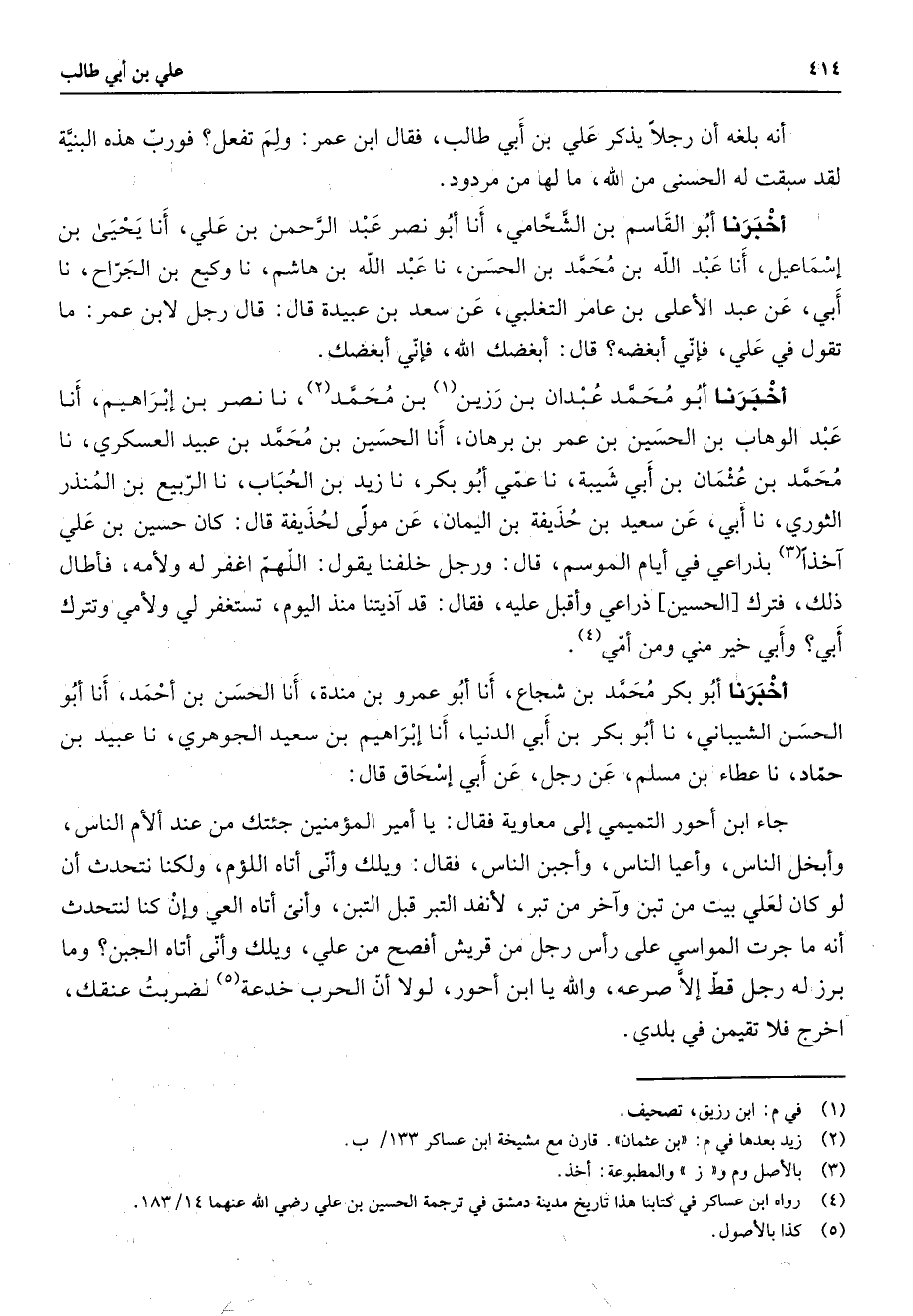 أنه بلغه أن رجلا يذكر علي بن أبي طالب فقال ابن عمر ولم تفعل فورب هذه البنية لقد سبقت له الحسنى من الله ما لها من مردود أخبرنا أبو القاسم بن الشحامي أنا أبو نصر عبد الرحمن بن علي أنا يحيى بن إسماعيل أنا عبد الله بن محمد بن الحسن نا عبد الله بن هاشم ناوكيع بن الجراح نا أبي عن عبد الأعلى بن عامر التغلبي عن سعد بن عبيدة قال قال رجل لابن عمر ما تقول في علي فإني أبغضه قال أبغضك الله فإني أبغضك أخبرنا أبو محمد عبدان بن رزين (1) بن محمد (2) نا نصر بن إبراهيم أنا عبد الوهاب بن الحسين بن عمر بن برهان أنا الحسين بن محمد بن عبيد العسكري نا محمد بن عثمان بن أبي شيبة نا عمي أبو بكر نا زيد بن الحباب نا الربيع بن المنذر الثوري نا أبي عسعيد بن حذيفة بن اليمان عن مولى لحذيفة قال كان حسين بن علي آخذا (3) بذراعي في أيام الموسم قال ورجل خلفنا يقول اللهم اغفر له ولأمه فأطال ذلك فترك الحسين ذراعي وأقبل عليه فقال قد اذيتنا منذ اليوم تستغفر لي ولأمي وتترك أبي وأبي خير مني ومن أمي (4) أخبرنا أبو بكر محمد بن شجاع أنا أبو عمرو بن مندة أنا الحسن بن أحمد أنا أبو الحسن الشيباني نا أبو بكر بن أبي الدنيا أنا إبراهيم بن سعيد الجوهري نا عبيد بن حماد نا عطاء بن مسلم عن رجل عن أبي إسحاق قال جاء ابن أحور التميمي إلى معاوية فقال يا أمير المؤمنين جئتك من عند ألأم الناس وأبخل الناس وأعيا الناس وأجبن الناس فقال ويلك وأنى أتاه اللؤم ولكنا نتحدث أن لو كان لعلي بيت من تبن واخر من تبر لأنفد التبر قبل التبن وأنى أتاه العي وإن كنا لنتحدث أنه ما جرت المواسي على رأس رجل من قريش أفصح من علي ويلك وأنى أتاه الجبن وما برز له رجل قط إلا صرعه والله يا ابن أحور لولا أن الحرب خدعة (5) لضربت عنقك أخرج فلا تقيمن في بلدي