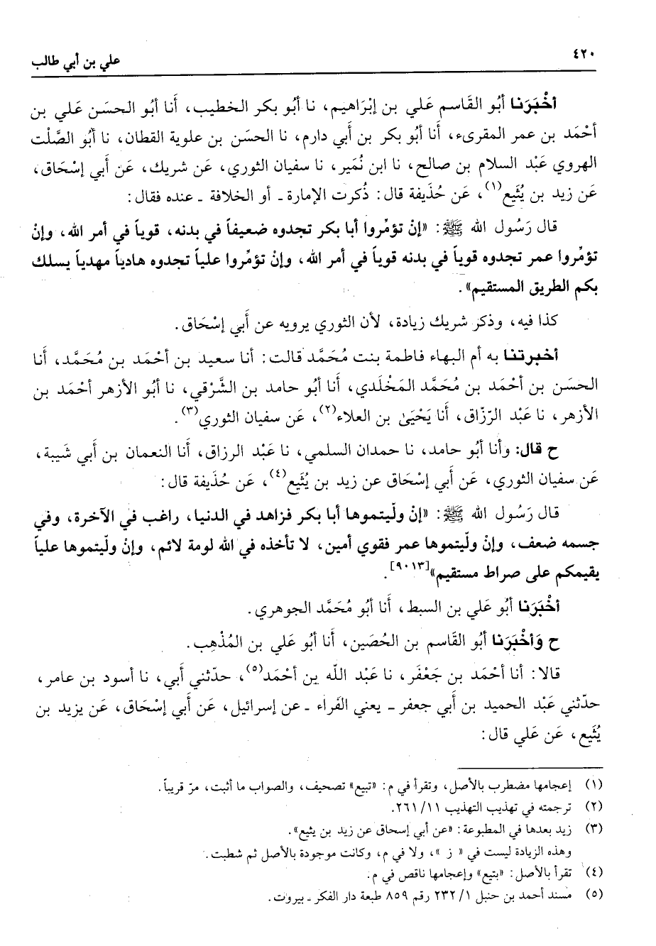 أخبرنا أبو القاسم علي بن إبراهيم نا أبو بكر الخطيب أنا أبو الحسن علي بن أحمد بن عمر المقرئ أنا أبو بكر بن أبي دارم نا الحسن بن علوية القطان نا أبو الصلت الهروي عبد السلام بن صالح نا ابن نمير نا سفيان الثوري عن شريك عن أبي إسحاق عن زيد بن يثيع (1) عن حذيفة قال ذكرت الإمارة أو الخلافة عنده فقال قال رسول الله (صلى الله عليه وسلم) إن تؤمروا أبا بكر تجدوه ضعيفا في بدنه قويا في أمر الله وإن تؤمروا عمر تجدوه قويا في بدنه قويا في أمر الله وإن تؤمروا عليا تجدوه هاديا مهديا يسلك بكم الطريق المستقيم كذا فيه وذكر شريك زيادة لأن الثوري يرويه عن أبي إسحاق أخبرتنا به أم البهاء فاطمة بنت محمد قالت أنا سعيد بن أحمد بن محمد انا الحسن بن أحمد بن محمد المخلدي أنا أبو حامد بن الشرقي نا أبو الأزهر أحمد بن الأزهر نا عبد الرزاق أنا يحيى بن العلاء (2) عن سفيان الثوري (3) ح وقال وأنا أبو حامد نا حمدان السلمي نا عبد الرزاق أنا النعمان بن أبي شيبان عن سفيان الثوري عن أبي إسحاق عن زيد بن يثيع (4) عن حذيفة قال قال رسول الله (صلى الله عليه وسلم) إن وليتموها أبا بكر فزاهد في الدنيا راغب في الاخرة وفي جسمه ضعف وإن وليتموها عمر فقوي أمين لا تأخذه في الله لومة لائم وإن وليتموها عليا يقيمكم على صراط مستقيم أخبرنا أبو علي بن السبط أنا أبو محمد الجوهري ح وأخبرنا أبو القاسم بن الحصين أنا أبو علي بن المذهب قالا أنا أحمد بن جعفر نا عبد الله بن أحمد (5) حدثني أبي نا أسود بن عامر حدثني عبد الحميد بن أبي جعفر يعني الفراء عن إسرائيل عن أبي إسحاق عن يزيد بن يثيع عن علي قال