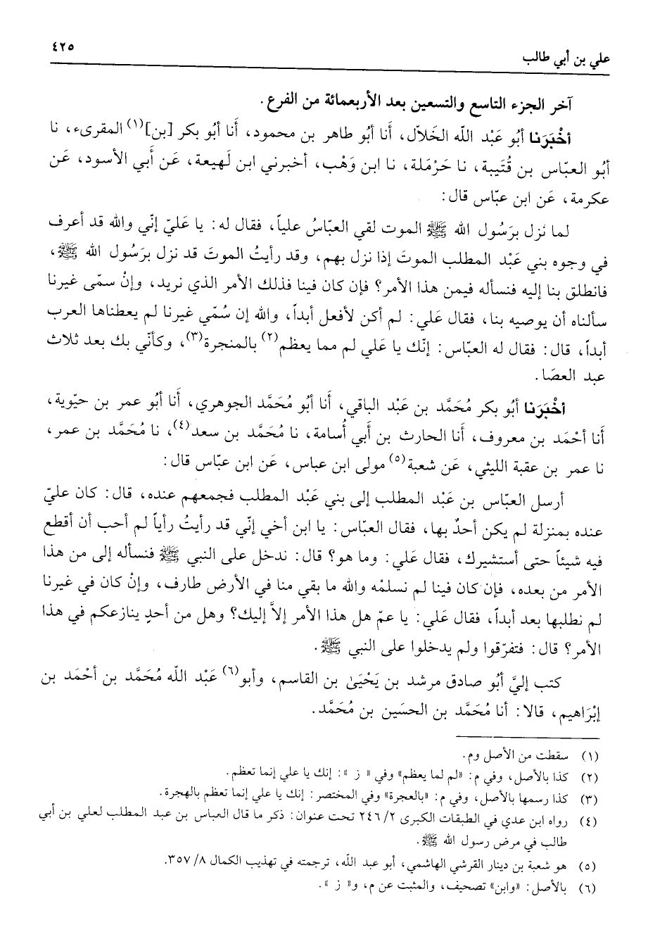 (4) رواه ابن عدي في الطبقات الكبرى 2 / 246 تحت عنوان: ذكر ما قال العباس بن عبد المطلب لعلي بن أبي طالب في مرض رسول الله صلى الله عليه وسلم