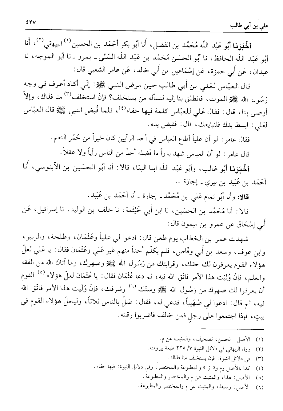 أخبرنا أبو عبد الله محمد بن الفضل أنا أبو بكر أحمد بن الحسين (1) البيهقي (2) أنا أبو عبد الله الحافظ نا أبو الحسن محمد بن عبد الله السني بمرو نا أبو الموجه نا عبدان عن أبي حمزة عن إسماعيل بن أبي خالد عن عامر الشعبي قال قال العباس لعلي بن أبي طالب حين مرض النبي (صلى الله عليه وسلم) إني أكاد أعرف في وجه رسول الله (صلى الله عليه وسلم) الموت فانطلق بنا إليه لنسأله من يستخلف فإن استخلف (3) منا فذاك وإلا أوصى بنا قال فقال علي للعباس كلمة فيها خفاء (4) فلما قبض النبي (صلى الله عليه وسلم) قال العباس لعلي ابسط يدك فلنبايعك قال فقبض يده فقال عامر لو أن عليا أطاع العباس في أحد الرأيين كان خيرا من حمر النعم قال عامر لو أن العباس شهد بدرا ما فضله أحد من الناس رأيا ولا عقلا أخبرنا أبو غالب وأبو عبد الله ابنا البنا قالا أنا أبو الحسين بن الابنوسي أنا أحمد بن عبيد بن بيري إجازة قالا وأنا أبو تمام علي بن محمد إجازة أنا أحمد بن عبيد قالا أنا محمد بن الحسين نا ابن أبي خيثمة نا خلف بن الوليد نا إسرائيل عن أبي إسحاق عن عمرو بن ميمون قال شهدت عمر بن الخطاب يوم طعن قال ادعوا لي عليا وعثمان وطلحة والزبير وابن عوف وسعد بن أبي وقاص فلم يكلم أحدا منهم غير علي وعثمان فقال يا علي لعل هؤلاء القوم يعرفون لك حقك وقرابتك من رسول الله (صلى الله عليه وسلم) وصهرك وما آتاك الله من الفقه والعلم فإن وليت هذا الأمر فاتق الله فيه ثم دعا عثمان فقال يا عثمان لعل هؤلاء (5) القوم أن يعرفوا لك صهرك من رسول الله (صلى الله عليه وسلم) وسنك (6) وشرفك فإن وليت هذا الأمر فاتق الله فيه ثم قال ادعو لي صهيبا فدعي له فقال صل بالناس ثلاثا وليحل هؤلاء القوم في بيت فإذا اجتمعوا على رجل فمن خالف فاضربوا رقبته