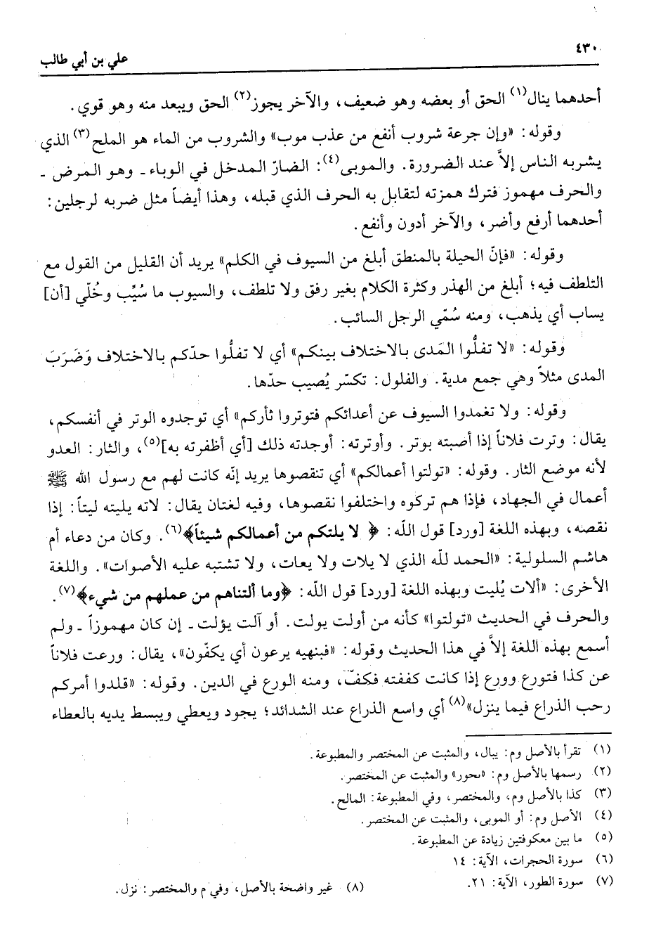 أحدهما ينال (1) الحق أو بعضه وهو ضعيف والاخر يجوز (2) الحق ويبعد منه وهو قوي وقوله وإن جرعة شروب أنفع من عذب موب والشروب من الماء هو الملح (3) الذي يشربه الناس إلا عند الضرورة والموبى (4) الضار المدخل في الوباء وهو المرض والحرف مهموز فترك همزته لتقابل به الحرف الذي قبله وهذا أيضا مثل ضربه لرجلين أحدهما أرفع وأضر والاخر أدون وأنفع وقوله فإن الحيلة بالمنطق أبلغ من السيوف في الكلم يريد أن القليل من القول مع التلطف فيه أبلغ من الهذر وكثرة الكلام بغير رفق ولا تلطف والسيوب ما سيب وخلي أن يساب أي يذهب ومنه سمي الرجل السائب وقوله لا تفلوا المدى بالاختلاف بينكم أي لا تغلوا حدكم بالاختلاف وضرب المدى مثلا وهي جمع مدية والفلول تكسر يصيب حدها وقوله ولا تغمدوا السيوف عن أعدائكم فتوتروا ثأركم أي توجدوه الوتر في أنفسكم يقال وترت فلانا أصبته بوتر وأوترته أوجدته ذلك أي أظفرته به (5) والثار العدو لأنه موضع الثار وقوله تولتوا أعمالكم أي تنقصوها يريد إنه كانت لهم مع رسول الله (صلى الله عليه وسلم) أعمال في الجهاد فإذا هم تركوه واختلفوا نقصوها وفيه لغتان يقال لاته يليته ليتا إذا نقصه وبهذه اللغة ورد قول الله " لا يلتكم من أعمالكم شيئا " (6) وكان من دعاء أم هاشم السلولية الحمد لله الذي لا يلات ولا يعات ولا تشتبه عليه الأصوات واللغة الأخرى ألات يليت وبهذه اللغة ورد قول الله " وما ألتناهم من عملهم من شئ " (7) والحرف في الحديث تولتوا كأنه من أولت يولت أو الت يؤلت إن كان مهموزا ولم أسمع بهذت اللغة إلا في هذا الحديث وقوله فبنهيه يرعون أيكفون يقال ورعت فلانا عن كذا فتورع وورع إذا كانت كففته فكف ومنه الورع في الدين وقوله قلدوا أمركم رحب الذراع فيما ينزل (8) أي واسع الذراع عند الشدائد يجود ويعطي ويبسط يديه بالعطاء