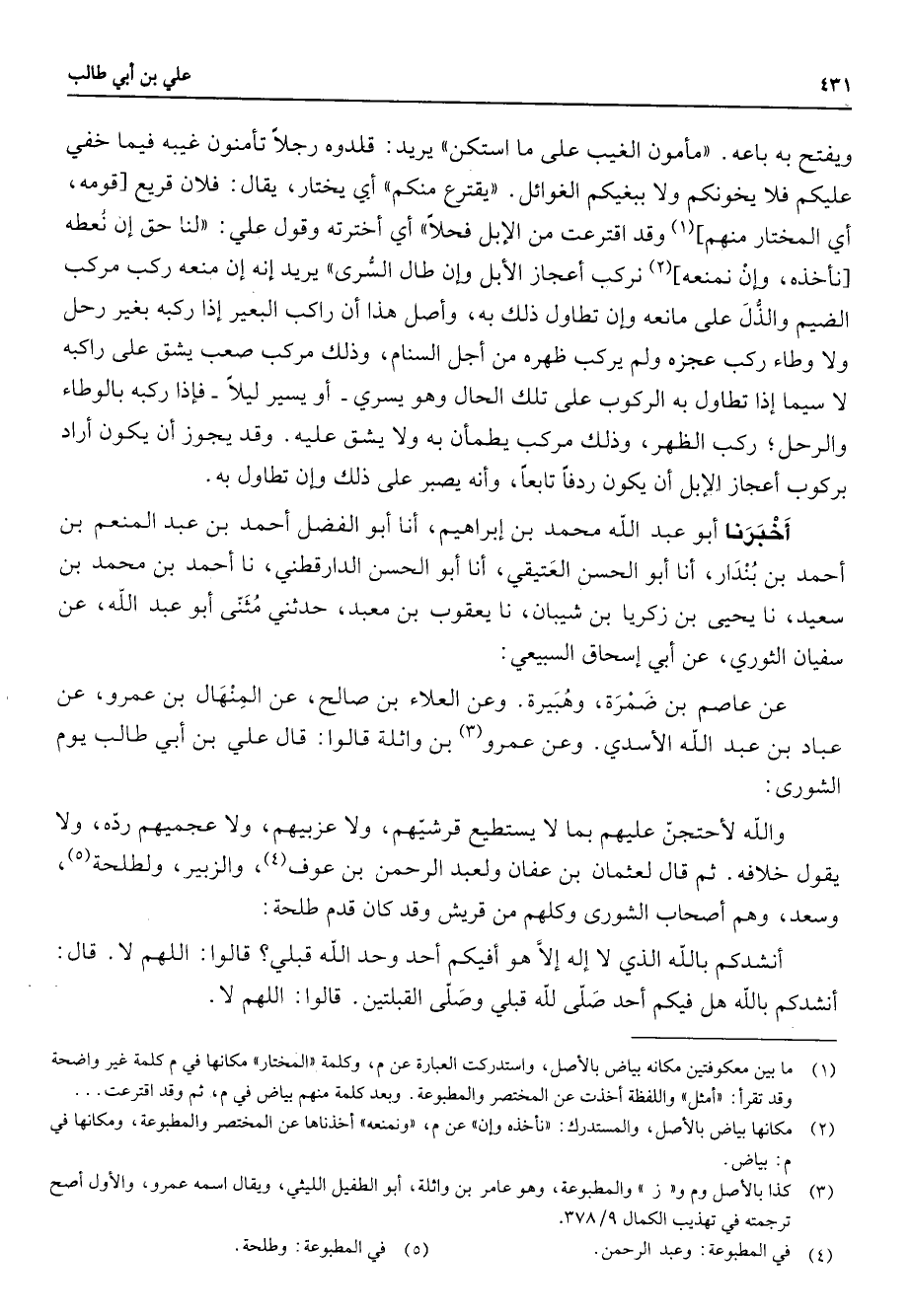 ويفتح به باعه مأمون الغيب على ما استكن يريد قلدورجلا تأمنون غيبه فيما خفي عليكم فلا يخونكم ولا ببغيكم الغوائل يقترع منكم أي يختار يقال فلان قريع قومه أي المختار منهم (1) وقد اقترعت من الإبل فحلا أي أخترته وقول علي لنا حق إن نعطه نأخذه وإن نمنعه (2) نركب أعجاز الأبل وإن طال السرى يريد إنه إن منعه ركب مركب الضيم والذل على مانعه وإن تطاول ذلك به وأصل هذا أن راكب البعير إذا ركبه بغير رحل ولا وطاء ركب عجزه ولم يركب ظهره من أجل السنام وذلك مركب صعب يشق على راكبه لا سيما إذا تطاول به الركوب على تلك الحال وهو يسري أو يسير ليلا فإذا ركبه بالوطاء والرحل ركب الظهر وذلك مركب يطمأن به ويشق عليه وقد يجوز أن يكون أراد بركوب أعجاز الإبل أن يكون ردفا تابعا وأنه يصبر على ذلك وإن تطاول به أخبرنا أبو عبد الله محمد بن إبراهيم أنا أبو الفضل أحمد بن عبد المنعم بن أحمد بن بندار أنا أبو الحسن العتيقي أنا أبو الحسن الدارقطني نا أحمد بن محمد بن سعيد نا يحيى بن زكريا بن شيبان نا يعقوب بن معبد حدثني مثنى أبو عبد الله عن سفيان الثوري عن أبي إسحاق السبيعي عن عاصم بن ضمرة وهبيرة وعن العلاء بن صالح عن المنهال بن عمرو عن عباد بن عبد الله الأسدي وعن عمرو (3) بن واثلة قالوا قال علي بن أبي طالب يوم الشورى والله لأحتجن عليهم بما لا يستطيع قرشيهم ولا عربيهم ولا عجميهم رده ولا يقول خلافهثم قال لعثمان بن عفان ولعبد الرحمن بن عوف (4) والزبير ولطلحة (5) وسعد وهم أصحاب الشورى وكلهم من قريش وقد كان قدم طلحة أنشدكم بالله الذي لا إله ألا هو أفيكم أحد وحد الله قبلي قالوا اللهم لا قال أنشدكم بالله هل فيكم أحد صلى لله قبلي وصلى القبلتين قالوا اللهم لا