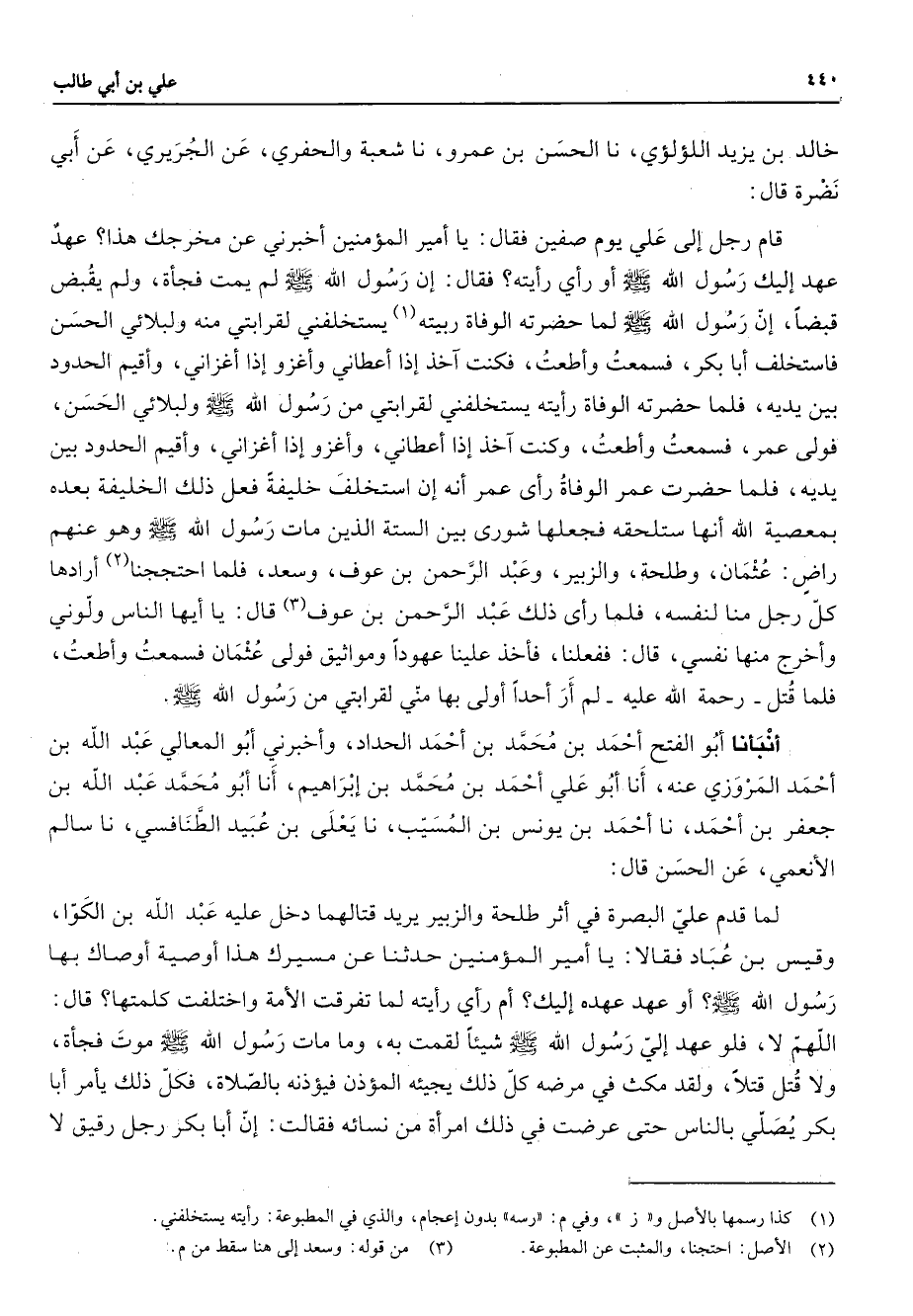 خالد بن يزيد اللؤلؤي نا الحسن بن عمرو نا شعبة والحفري عن الجريري عن أبي نضرة قال قام رجل إلى علي يوم صفين فقال يا أمير المؤمنين أخبرني عن مخرجك هذا عهد عهد إليك رسول الله (صلى الله عليه وسلم) أو رأي رأيته فقال إن رسول الله (صلى الله عليه وسلم) لم يمت فجأة ولم يقيض قبضا إن رسول الله (صلى الله عليه وسلم) لما حضرته الوفاة ربيته (1) يستخلفني لقرابتي منه ولبلائي الحسن فاستخلف أبا بكر فسمعت وأطعت فكنت اخذ إذا أعطاني وأغزو إذا أغزاني وإقيم الحدود بين يديه فلما حضرته الوفاة رأيته يستخلفني لقرابتي من رسول الله (صلى الله عليه وسلم) ولبلائي الحسن فولى عمر فسمعت وأطعت وكنت اخذ إذ أعطاني وأغزوا إذا أغزاني وأقيم الحدود بين يديه فلما حضرت عمر الوفاة رأى عمر أنه إن استخلف خليفة فعل ذلك الخليفة بعده بمعصية الله أنها ستلحقه فجعلها شورى بين الستة الذين مات رسول الله (صلى الله عليه وسلم) وهو عنهم راض عثمان وطلحة والزبير وعبد الرحمن بن عوف وسعد فلما احتجحنا (2) أرادها كل رجل منا لنفسه فلما رأى ذلك عبد الرحمن بن عوف (3) قال يا أيها الناس ولوني وأخرج منها نفسي قال ففعلنا فأخذ علينا عهودا ومواثيق فولى عثمان فسمعت وأطعت فلما قتل رحمة الله عليه لم أر أحدا أولى بها مني لقرابتي من رسول الله (صلى الله عليه وسلم) أنبانا أبو الفتح أحمد بن محمد أحمد بن الحداد وأخبرني أبو المعالي عبد الله بن أحمد المروزي عنه أنا أبو علي أحمد بن محمد بن إبراهيم أنا أبو محمد عبد الله بن جعفر بن أحمد نا أحمد بن يونس بن المسيب نا يعلى بن عبيد الطنافسي نا سالم الأنعمي عن الحسن قال لما قدم علي البصرة في أثر طلحة والزبير يريد قتالهما دخل عليه عبد الله بن الكوا وقيس بن عباد فقالا يا أمير المؤمنين حدثنا عن مسيرك هذا أوصية أوصاك بها رسول الله (صلى الله عليه وسلم) أو عهد عهده إليك أم رأي رأيته لما تفرقت الأمة واختلفت كلمتها قال اللهم لا فلو عهد إلي رسول الله (صلى الله عليه وسلم) شيئا لقمت به وما مات رسول الله (صلى الله عليه وسلم) موت فجأة ولا قتل قتلا ولقد مكث في مرضه كل ذلك يجيئه المؤذن فيؤذنه بالصلاة فكل ذلك يأمر أبا بكر يصلي بالناس حتى عرضت في ذلك امرأة من نسئه فقالت إن أبا بكر رجل رقيق لا