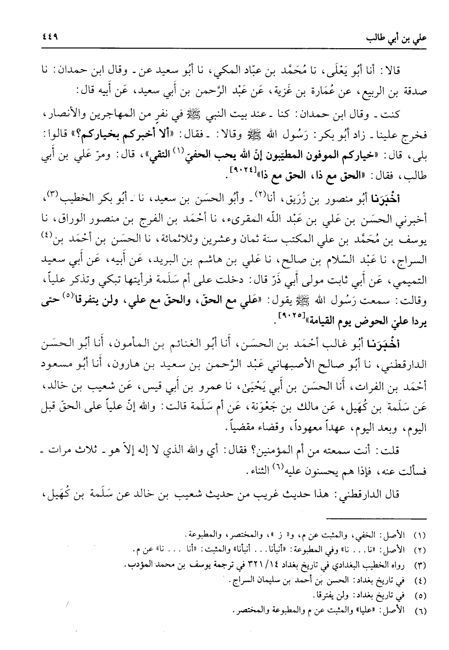قالا أنا أبو يعلى نا محمد بن عباد المكي نا أبو سعيد عن وقال ابن حمدان نا صدقة بن الربيع عن عمارة بن غزية عن عبد الرحمن بن أبي سعيد عن أبيه قال كنت وقال ابن حمدان كنا عند بيت النبي (صلى الله عليه وسلم) في نفر من المهاجرين والأنصار فخرج علينا زاد أبو بكر رسول الله (صلى الله عليه وسلم) وقالا فقال ألا أخبركم بخياركم قالوا بلى قال خياركم الموفون المطيبون إن الله يحب الحفي (1) التقي قال ومر علي بن أبي طالب فقال الحق مع ذا الحق مع ذا أخبرنا أبو منصور بن زريق أنا (2) وأبو الحسن بن سعيد نا أبو بكر الخطيب (3) أخبرني الحسن بن علي بن عببد الله المقرئ نا أحمد بن الفرج بن منصور الوراق نا يوسف بن محمد بن علي المكتب سنة ثمان وعشرين وثلاثمائة نا الحسن بن أحمد بن (4) السراج نا عبد السلام بن صالح نا علي بن هاشم بن البريد عن أبيه عن ابي سعيد التميمي عن أبي ثابت مولى أبي ذر قال دخلت على أم سلمة فرأيتها تبكي وتذكر عليا وقالت سمعت رسول الله (صلى الله عليه وسلم) يقول علي مع الحق والحق مع علي ولن يتفرقا (5) حتى يردا علي الحوض يوم القيامة أخبرنا أبو غالب أحمد بن الحسن أنا أبو الغنائم بن المأمون أنا أبو الحسن الدارقطني نا أبو صالح الأصبهاني عبد الرحمن بن سعيد بن هارون أنا أبو مسعود أحمد بن الفرات أنا الحسن بن أبي يحيى نا عمرو بن أبي قيس عن شعيب بن خالد عن سلمة بن كهيل عن مالك بن جعونة عن أم سلمة قالت والله إن عليا على الحق قبل اليوم وبعد اليوم عهدا معهودا وفضاء مقضيا قلت أنت سمعته من أم المؤمنين فقال أي والله الذي لا إله إلا هو ثلاث مرات فسألت عنه فإذا هم يحسنون عليه (6) الثناء قال الدارقطني هذا حديث غريب من حديث شعيب بن خالد عن سلمة بن كهيل