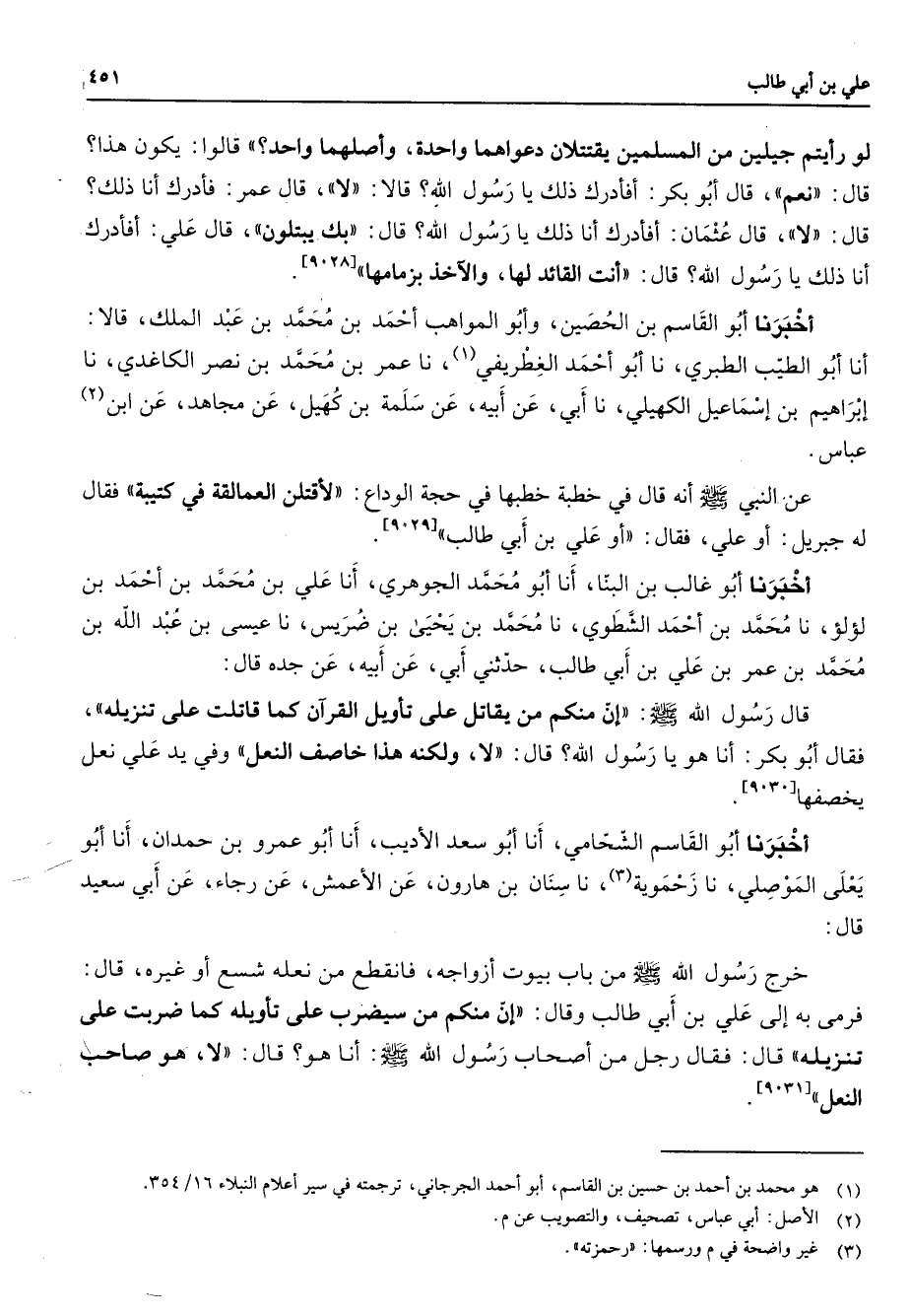 لو رأيتم جيلين من المسلمين يقتتلان دعواهما واحدة وأصلهما واحد قالوا يكون هذا قال نعم قال أبو بكر أفأدرك ذلك يا رسول الله قال لا قال عمر فأدرك أنا ذلك قال لا قال عثمان أفأدرك أنا ذلك يا رسول الله قال بك يبتلون قال علي أفأدرك أنا ذلك يا رسول الله قال أنت القائد لها والاخذ بزمامها أخبرنا أبو القاسم بن الحصين وأبو المواهب أحمد بن محمد بن عبد الملك قالا أنا أبو الطيب الطبري نا أبو أحمد الغطريفي (1) نا عمر بن محمد بن نصر الكاغدي نا إبراهيم بن إسماعيل الكهيلي نا أبي عن أبيه عن سلمة بن كهيل عن مجاهد عن ابن (2) عباس عن النبي (صلى الله عليه وسلم) أنه قال في خطبة خطبها في حجة الوداع لأقتلن العمالقة في كتيبة فقال له جبريل أو علي فقال أو علي بن أبي طالب أخبرنا أبو غالب بن البنا أنا أبو محمد الجوهري أنا علي بن محمد بن أحمد بن لؤلؤ نا محمد بن أحمد الشطوي نا محمد بن يحيى بن ضريس نا عيسى بن عبد الله بن محمد بن عمر بن علي بن أبي طالب حدثني أبي عن أبيه عن جده قال قال رسول الله (صلى الله عليه وسلم) إن منكم من يقاتل على تأويل القران كما قاتلت على تنزيله فقال أبو بكر أنا هو يا رسول الله قال لا ولكنه هذا خاصف النعل وفي يد علي نعل يخصفها أخبرنا أبو القاسم الشحامي أنا أبو سعد الأديب أنا أبو عمرو بن حمدان أنا أبو يعلى الموصلي نا زحموية (3) نا سنان بن هارون عن الأعمش عن رجاء عن أبي سعيد قال خرج رسول الله (صلى الله عليه وسلم) من باب بيوت أزواجه فانقطع من نعله شسع أو غيره قال فرمى به إلى علي بن أبي طالب وقال إن منكم من سيضرب على تأويله كما ضربت على تنزيله قال فقال رجل من أصحاب رسول الله (صلى الله عليه وسلم) أنا هو قال لا هو صاحب النعل