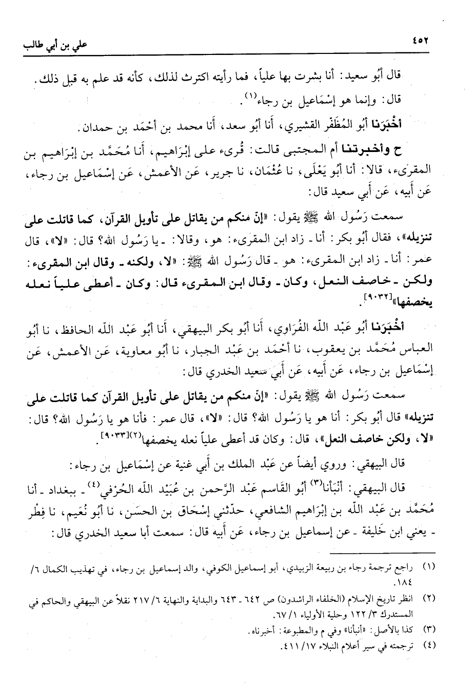 قال أبو سعيد أنابشرت بها عليا فما رأيته اكترث لذلك كأنه قد علم به قبل ذلك قال وإنما هو إسماعيل بن رجاء (1) أخبرنا أبو المظفر القشيري أنا أبو سعد أنا محمد بن أحمد بن حمدان ح وأخبرتنا أم المجتبى قالت قرئ على إبراهيم أنا محمد بن إبراهيم بن المقرئ قالا أنا أبو يعلى نا عثمان نا جرير عن الأعمش عن إسماعيل بن رجاء عن أبيه عن أبي سعيد قال سمعت رسول الله (صلى الله عليه وسلم) يقول إن منكم من يقاتل على تأويل القران كما قاتلت على تنزيله فقال أبو بكر أنا زاد ابن المقرئ هو وقالا يا رسول الله قال لا قال عمر أنا زاد ابن المقرئ هو قال رسول الله لا ولكنه وقال ابن المقرئ ولكن خاصف النعل وكان وقال ابن المقرئ قال وكان أعطى عليا نعله يخصفها أخبرنا أبو عبد الله الفراوي أنا أبو بكر البيهقي أنا أبو عبد الله الحافظ نا أبو العباس محمد بن يعقوب نا أحمد بن عبد الجبار نا أبو معاوية عن الأعمش عن إسماعيل بن رجاء عن أبيه عن أبي سعيد الخدري قال سمعت رسول الله (صلى الله عليه وسلم) يقول إن منكم من يقاتل على تأويل القران كما قاتلت على تنزيله قال أبو بكر أنا هو يا رسول الله قال لا قال عمر فأنا هو يا رسول الله قال لا ولكن خاصف النعل قال وكان قد أعطى عليا نعله يخصفها (2) قال البيهقي وروي أيضا عن عبد الملك بن أبي غنية عن إسماعيل بن رجاء قال البيهقي أنبأنا (3) أبو القاسم عبد الرحمن بن عبيد الله الحرفي (4) ببغداد أنا محمد بن عبد الله بن إبراهيم الشافعي حدثني إسحاق بن الحسن نا أبو نعيم نا فطر يعني ابن خليفة عن أسماعيل بن رجاء عن أبيه قال سمعت أبا سعيد الخدري قال