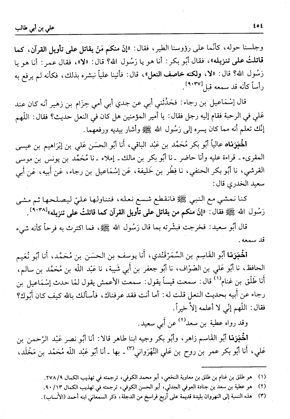 وجلسنا حوله كأنما على رؤوسنا الطير فقال إن منكم من يقاتل على تأويل القران كما قاتلت على تنزيله فقال أبو بكر أنا هو يا رسول الله قال لا فقال عمر أنا هو يا رسول الله قال لا ولكنه خاصف النعل قال فأتينا عليا نبشره بذلك فكأنه لم يرفع به رأسا كأنه قد سمعه قبل قال إسماعيل بن رجاء فحدثني أبي عن جدي أبي أمي حزام بن زهير أنه كان عند علي في الرحبة فقام إليه رجل فقال يا أمير المؤمنين هل كان في النعل حديث فقال اللهم أنك تعلم أنه مما كان يسره إلى رسول الله (صلى الله عليه وسلم) وأشار بيديه ورفعهما أخبرناه عاليا أبو بكر محمد بن عبد الباقي أنا أبو الحسن علي بن إبراهيم بن عيسى المقرئ قراءة عليه وأنا حاضر نا أبو بكر بن مالك إملاء نا محمد بن يونس بن موسى القرشي نا أبو بكر الحنفي نا فطر بن خليفة عن إسماعيل بن رجاء عن أبيه عن أبي سعيد الخدري قال كنا نمشي مع النبي (صلى الله عليه وسلم) فانقطع شسع نعله فتناولها علي ليصلحها ثم مشى رسول الله (صلى الله عليه وسلم) فقال إن منكم من يقاتل على تأويل القران كما قاتلت على تنزيله قال أبو سعيد فخرجت فبشرته بما قال رسول الله (صلى الله عليه وسلم) فما اكترث به فرحا كأنه شئ قد سمعه أخبرنا أبو القاسم بن السمرقندي أنا يوسف بن الحسن بن محمد أنا أبو نعيم الحافظ نا أبو علي بن الصواف نا أبو جعفر بن أبي شيبة نا عبد الله بن محمد بن سالم أنا طلق بن غنام (1) قال سمعت قيسا يقول سمعت الأعمش يقول لما حدث إسماعيل بن رجاء عن أبيه بحديث النعل قلت له أما أنت فقد عرفناك فأسألك بالله كيف كان أبوك فقال اللهم إني لا أعلمه إلا خيرا وقد رواه عطية بن سعد (2) عن أبي سعيد أخبرنا أبو القاسم زاهر وأبو بكر وجيه ابنا طاهر قالا أنا أبو نصر عبد الرحمن بن علي أنا أبو بكر عمر بن روح بن علي النهرواني (3) بها أنا أبو عبد الله محمد بن مخلد