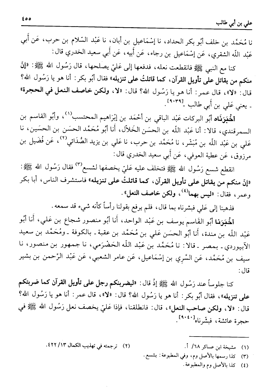 نا محمد بن خلف أبو بكر الحداد نا إسماعيل بن أبان نا عبد السلام بن حرب عن أبي عبد الله الشقري عن إسماعيل بن رجاء عن أبيه عن ابي سعيد الخدري قال كنا مع النبي (صلى الله عليه وسلم) فانقطعت نعله فدفعها إلى علي يصلحها قال رسول الله (صلى الله عليه وسلم) إن منكم من يقاتل على تأويل القران كما قاتلت على تنزيله فقال أبو بكر أنا هو يا رسول الله (صلى الله عليه وسلم) قال لا قال عمر أنا هو يا رسول الله (صلى الله عليه وسلم) قال لا ولكن خاصف النعل في الحجرة يعني علي بن أبي طالب أخبرناه أبو البركات عبد الباقي بن أحمد بن إبراهيم المحتسب (1) وأبو القاسم بن السمرقندي قالا انا عبد الله بن الحسن الخلال أنا أبو محمد الحسن بن الحسين نا علي بن عبد الله بن مبشر نا محمد بن حرب نا علي بن يزيد الصدائي (2) عن فضيل بن مرزوق عن عطية العوفي عن أبي سعيد الخدري قال انقطع شسع رسول الله (صلى الله عليه وسلم) فتخلف عليه علي يخصفها لشسع (3) فقال رسول الله (صلى الله عليه وسلم) إن منكم من يقاتل على تأويل القران كما قاتلت على تنزيله فاستشرف الناس أبا بكر وعمر فقال ليس بهما (4) ولكن خاصف النعل فذهبنا إلى علي فبشرناه بما قال فلم يرفع بقولنا رأسا كأنه شئ قد سمعه اخبرنا أبو القاسم يوسف بن عبد الواحد أنا أبو منصور شجاع بن علي أنا أبو عبد الله بن مندة أنا أبو الحسن علي بن محمد بن عقبة بالكوفة ومحمد بن سعيد الابيوردي بمصر قالا نا محمد بن عبد الله الحضرمي نا جمهور بن منصور نا سيف بن محمد عن السري بن إسماعيل عن عامر الشعبي عن عبد الرحمن بن بشير قال كنا جلوسا عند رسول الله (صلى الله عليه وسلم) إذ قال ليضربنكم رجل على تأويل القران كما ضربتكم على تنزيله فقال أبو بكر أنا هو يا رسول الله قال لا قال عمر أنا هو يا رسول الله قال لا ولكن صاحب النعل قال فانطلقنا فإذا علي يخصف نعل رسول الله (صلى الله عليه وسلم) في حجرة عائشة فبشرناه