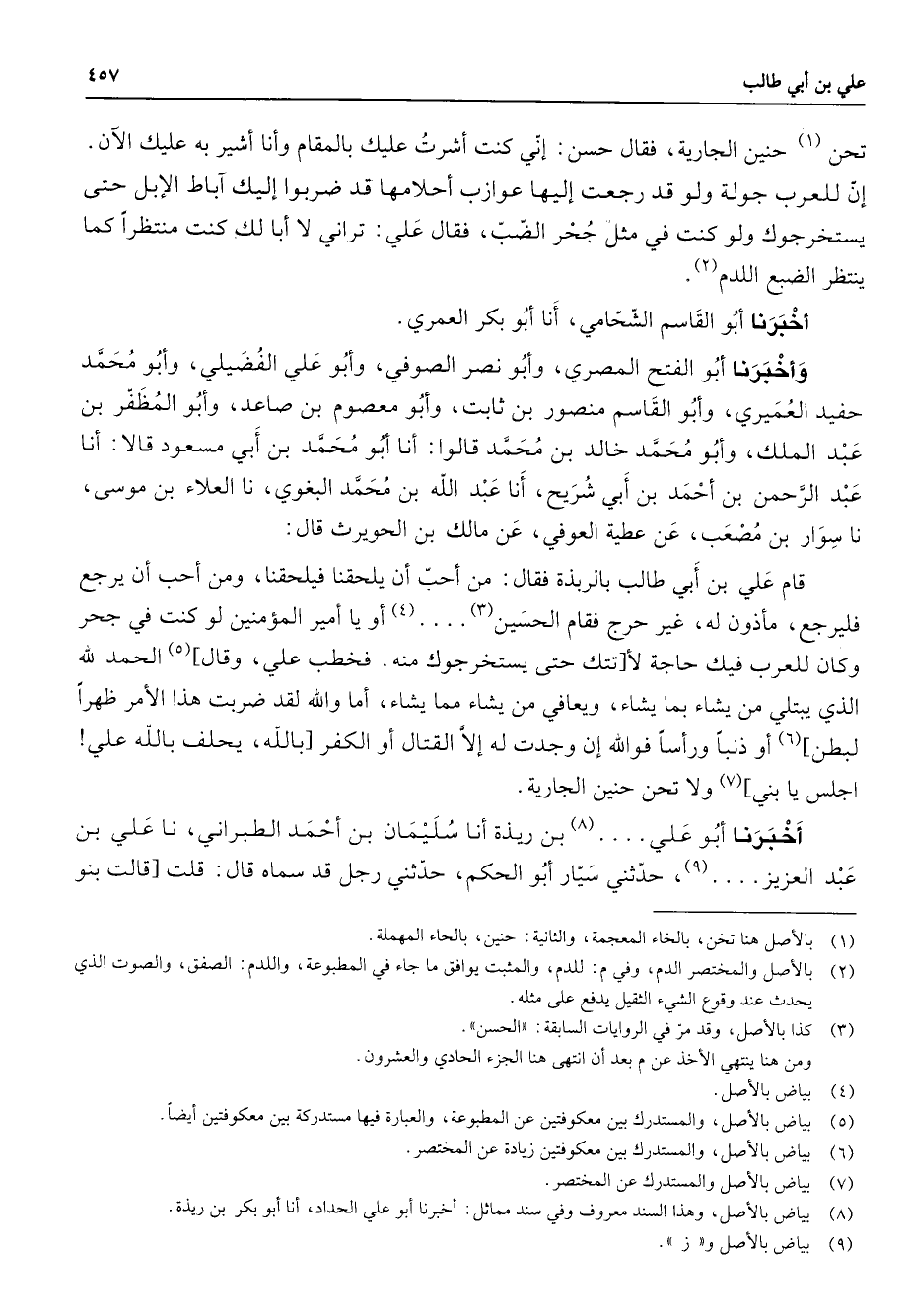 (4) أو يا أمير المؤمنين لو كنت في جحر وكان للعرب فيك حاجة لأتتك حتى يستخرجوك منه فخطب علي وقال (5) الحمد لله الذي يبتلى من يشاء بما يشاء ويعافي من يشاء مما يشاء أما والله لقد ضربت هذا الأمر ظهرا لبطن (6) أو ذنبا ورأسا فوالله إن وجدت له إلا القتال أو الكفر بالله يحلف بالله علي اجلس يا بني (7) ولا تحن حنين الجارية أخبرنا أبو علي