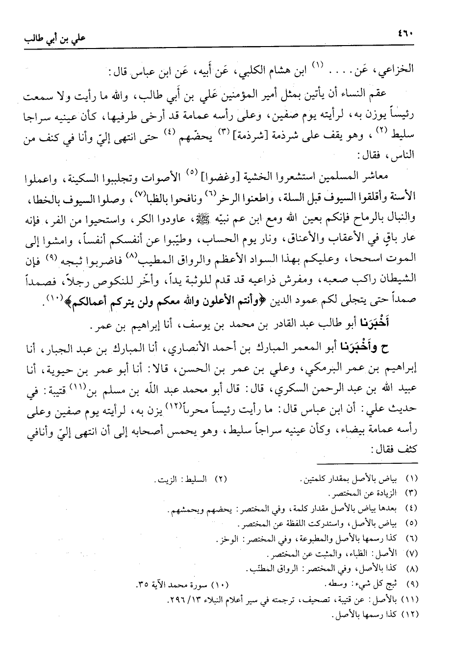 (1) ابن هشام الكلبي عن أبيه عن أبن عباس قال عقم النساء أن يأتين بمثل أمير المؤمن علي بن أبي طالب والله ما رأيت ولا سمعت رئيسا يوزن به لرأيته يوم صفين وعلى رأسه عمامة قد أرخى طرفيها كأن عينيه سراجا سليط (2) وهو يقف على شرذمة شرذمة (3) يحضهم (4) حتى انتهى إلي وأنا في كنف من الناس فقال معاشر المسلمين استشعروا الخشية وغضوا (5) الأصوات وتجلببوا السكينة واعملوا الأسنة وأقلقوا السيوف قبل السلة واطعنوا الرخر (6) ونافحوا بالظبا (7) وصلوا السيوف بالخطا والنبال بالرماح فإنكم بعين الله ومع ابن عم نبيه (صلى الله عليه وسلم) عاودوا الكر واستحيوا من الفر فإنه عار باق في الأعقاب والأعناق ونار يوم الحساب وطيبوا عن أنفسكم أنفسا وامسوا إلى الموت اسححا وعليكم بهذا السواد الأعظم والرواق المطيب (8) فاضربوا ثبحه (9) فإن الشيطان راكب صعبه ومفرش دراعيه قد قدم للوثبة يدا وأخر للنكوص رجلا فصمدا صمدا حتى يتجلى لكم عمود الدين " وأنتم الأعلون والله معكم ولن يتركم أعمالكم " (10) أخبرنا أبو طالب عبد القادر بن محمد بن يوسف أنا إبراهيم بن عمر ح وأخبرنا أبو المعمر المبارك بن أحمد الأنصاري أنا المبارك بن عبد الجبار أنا إبراهيم بن عمر البرمكي وعلي بن عمر بن الحسن قالا أنا أبو عمر بن حيوية أنا عبيد الله بن عبد الرحمن السكري قال قال أبو محمد عبد الله بن مسلم بن (11) قتيبة في حديث علي أن ابن عباس قال ما رأيت رئيسا محربا (12) يزن به لرأيته يوم صفين وعلى رأسه عمامة بيضاء وكأن عينيه سراجا سليط وهو يحمس أصحابه إلى أن انتهى إلي وأنا في كثف فقال
