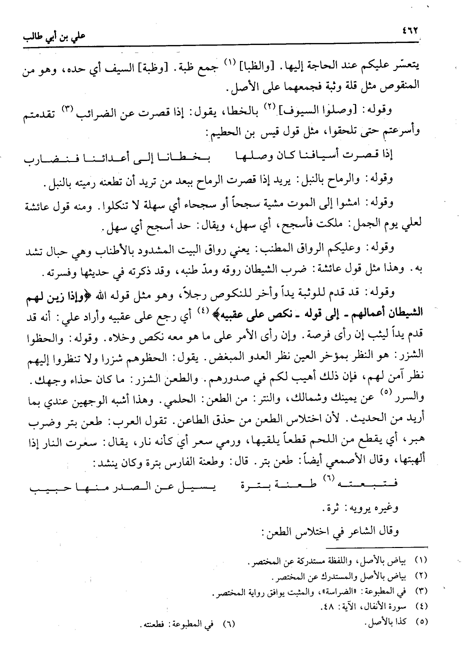 يتعسر عليكم عند الحاجة إليها والظبا (1) جمع ظبة وظبة السيف أي حده وهو من المنقوص مثل قلة وثبة فجمعهما على الأصل وقوله وصلوا السيوف (2) بالخطا يقول إذا قصرت عن الضرائب (3) تقدمتم وأسرعتم حتى تلحقوا مثل قول قيس بن الحطيم * إذا قصرت أسيافنا كان وصلها * بخطانا إلى أعدائنا فنضارب * وقوله والرماح بالنبل يريد إذا قصرت الرماح ببعد من تريد أن تطعنه رميته بالنبل وقوله امشوا إلى الموت مشية سجحا أو سجحاء أي سهلة لا تنكلوا ومنه قول عائشة لعلي يوم الجمل ملكت فأسجح أي سهل ويقال حد أسجح أي سهل وقوله وعليكم الرواق المطنب يعني رواق البيت المشدود بالأطناب وهي حبال تشد به وهذا مثل قول عائشة ضرب الشيطان روقه ومد طنبه وقد ذكرته في حديثها وفسرته وقوله قد قدم للوثبة يدا وأخر للنكوص رجلا وهو مثل قوله الله " وإذا زين لهم الشيطان أعمالهم إلى قوله نكص على عقبيه " (4) أي رجع على عقبيه وأراد علي أنه قد قدم يدا ليثب إن رأى فرصة وإن رأى الأمر على ما هو معه نكص وخلاه وقوله والحظوا الشزر هو النظر بمؤخر العين نظر العدو المبغض يقول الحظوهم شزرا ولا تنظروا إليهم نظر امن لهم فإن ذلك أهيب لكم في صدورهم والطعن الشزر ما كان حذاء وجهك والسرر (5) عن يمينك وشمالك والنتر من الطعن الحلمي وهذا أشبه الوجهين عندي بما أريد من الحديث لأن اختلاس الطعن من حذق الطاعن تقول العرب طعن بتر وضرب هبر أي يقطع من اللحم قطعا يلقيها ورمي سعر أي كأنه نار يقال سعرت النار إذا ألهبتها وقال الأصمعي أيضا طعن بتر قال وطعنة الفارس بترة وكان ينشد * فتبعته طعنة بترة * يسيل عن الصدر منها حبيب * وغيره يرويه ثرة وقال الشاعر في اختلاس الطعن