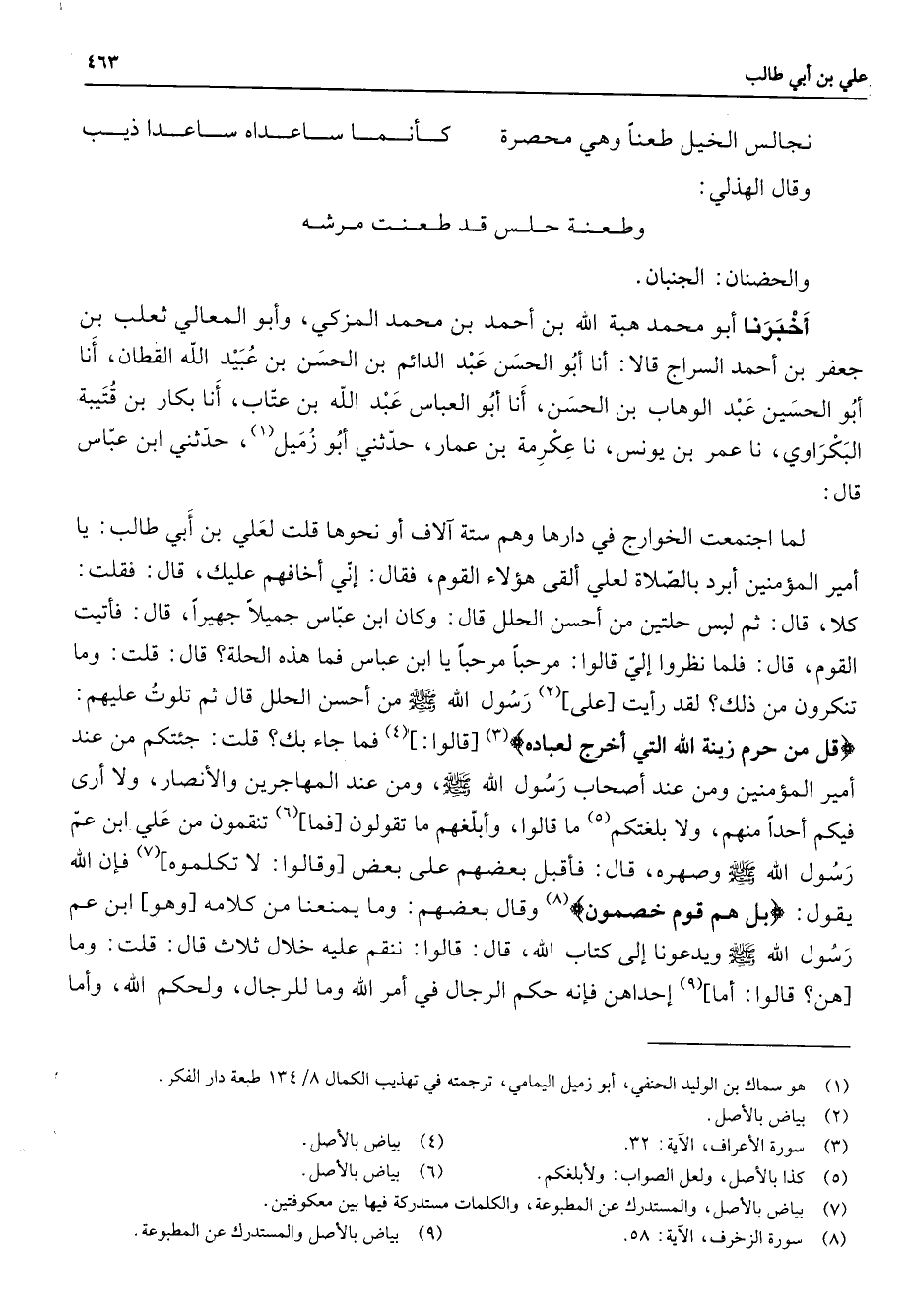 نجالس الخيل طعنا وهي محصرة * كأنما ساعداه ساعدا ذيب * وقال الهذلي * وطعنه حلس قد طعنت مرشه والحضنان الجنبان أخبرنا أبو محمد هبة الله بن أحمد بن محمد المزكي وأبو المعالي ثعلب بن جعفر بن أحمد السراج قالا أنا أبو الحسن عبد الدائم بن الحسن بن عبيد الله القطان أنا أبو الحسين عبد الوهاب بن الحسن أنا أبو العباس عبد الله بن عتاب أنا بكار بن قتيبة البكراوي نا عمر بن يونس نا عكرمة بن عمار حدثني أبو زميل (1) حدثني ابن عباس قال لما اجتمعت الخوارج في دارها وهم ستة الاف أو نحوها قلت لعلي بن أبي طالب يا أمير المؤمنين أبرد بالصلاة لعلي ألقى هؤلاء القوم فقال إني أخافهم عليك قال فقلت كلا قال ثم لبس حلتين من أحسن الحلل قال وكان ابن عباس جميلا جهيرا قال فأتيت القوم قال فلما نظروا إلي قالوا مرحبا مرحبا يا ابن عباس فما هذه الحلة قال قلت وما تنكرون من ذلك لقد رأيت على (2) رسول الله (صلى الله عليه وسلم) من أحسن الحلل قال ثم تلوت عليهم " قل من حرم زينة الله التي أخرج لعباده " (3) قالوا (4) فما جاء بك قلت جئتكم من عند أمير المؤمنين ومن عند أصحاب رسول الله (صلى الله عليه وسلم) ومن عند المهاجرين والأنصار ولا أرى فيكم أحد منهم ولا بلغتكم (5) ما قالوا وأبلغهم ما تقولون فما (6) تنقمون من علي ابن عم رسول الله (صلى الله عليه وسلم) وصهره قال فأقبل بعضهم على بعض وقالوا لا تكلموه (7) فإن الله يقول " بل هم قوم خصمون " (8) وقال بعضهم وما يمنعنا من كلامه وهو ابن عم رسول الله (صلى الله عليه وسلم) ويدعونا إلى كتاب الله قال قالوا ننقم عليه خلال ثلاث قال قلت وما هن قالوا أما (9) إحداهن فإنه حكم الرجال في أمر الله وما للرجال ولحكم الله وأما