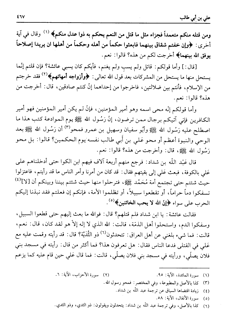 ومن قتله منكم معتمدا فجزاء مثل ما قتل من النعم يحكم به ذوا عدل منكم " (1) وقال في اية أخرى " وإن خفتم شقاق بينهما فابعثوا حكما من أهله وحكما من أهلها إن يريدا إصلاحا يوفق الله بينهما " أخرجت لكم من هذه قالوا نعم قال وأما قولكم قاتل ولم يسب ولم يغنم فأيكم كان يسبي عائشة فإن قلتم إنما يستحل منها ما يستحل من المشركات بعد قول الله تعالى " وأزواجه أمهاتهم " (2) فقد خرجتم من الإسلام فأنتم بين ضلالتين فاخرجوا من إحداهما إن كنتم صادقين قال أخرجت من هذه قالوا نعم وأما قولكم إنه محى اسمه وهو أمير المؤمنين فإن لم يكن أمير المؤمنين فهو أمير الكافرين فإني اتيكم برجال ممن ترضون إن رسول الله (صلى الله عليه وسلم) يوم الموادعة كتب هذا ما اصطلح عليه رسول لله (صلى الله عليه وسلم) وأبو سفيان وسهيل بن عمرو فمحو (3) أن رسول الله (صلى الله عليه وسلم) بعد الوحي والنبوة أعظم أو محو علي بن أبي طالب نفسه يوم الحكمين قالوا بل محو رسول الله (صلى الله عليه وسلم) قال وأخرجت من هذه قالوا نعم قال عبد الله بن شداد فرجع منهم أربعة الاف فيهم ابن الكوا حتى أدخلناهم على علي بالكوفة فبعث علي إلى بقيتهم فقال قد كان من أمرنا وأمر الناس ما قد رأيتم فاعتزلوا حيث شئتم حتى تجتمع أمة محمد (صلى الله عليه وسلم) فترحلوا منها حيث شئتم بيننا وبينكم أن لا (4) تسفكوا دما حراما أو تقطعوا سبيلا أو تظلموا الأمة فإنكم إن فعلتم فقد نبذنا إليكم الحرب على سواء " إن الله لا يحب الخائنين " (5) فقالت عائشة يا با ابن شداد فلم قتلهم قال فوالله ما بعث إليهم حتى قطعوا السبيل وسفكوا الدم واستحلوا أهل الذمة قالت الله الذي لا إله إلا هو لقد كان قال نعم قالت فما شئ بلغني عن أهل العراق تتحدثون (6) ذو الثدية قال قد رأيته وقمت عليه مع علي في القتلى فدعا الناس فقال هل تعرفون هذا فما أكثر من قال رأيته في مسجد بني فلان يصلي ورأيته في مسجد بني فلان يصلي قالت فما قال علي حين قام عليه كما يزعم
