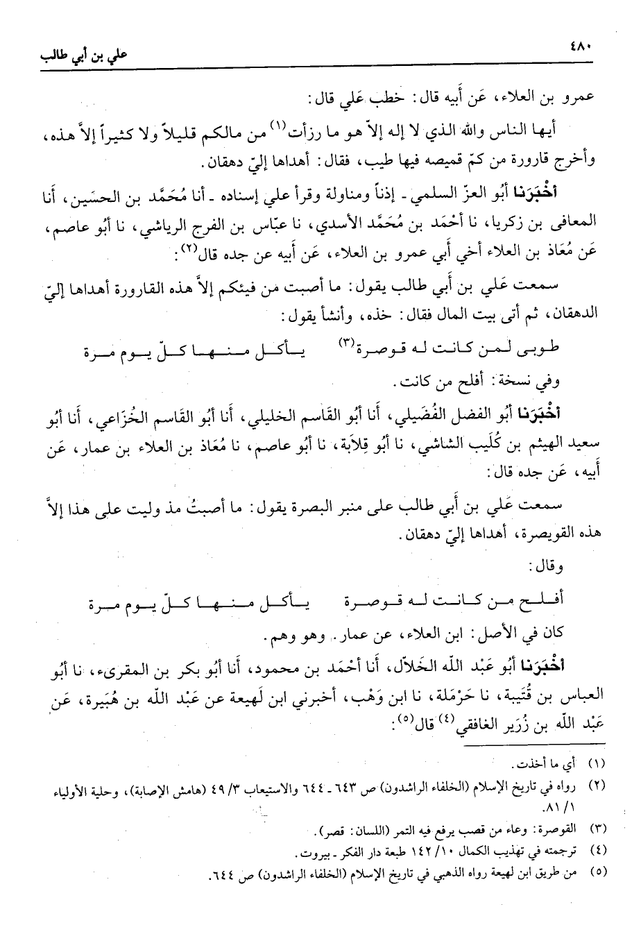عمرو بن العلاء عن ابيه قال خطب علي قال أيها الناس والله الذي لا إله إلا هو ما رزأت (1) من مالكم قليلا ولا كثيرا إلا هذه وأخرج قارورة من كم قميصه فيها طيب فقال أهداها إلي دهقان أخبرنا أبو العز السلمي إذنا ومناولة وقرأ علي إسناده أنا محمد بن الحسين أنا المعافى بن زكريا نا أحمد بن محمد الأسدي نا عباس بن الفرج الرياشي نا أبو عاصم عن معاذ بن العلاء أخي أبي عمرو بن العلاء عن أبيه عن جده قال (2) سمعت علي بن أبي طالب يقول ما أصبت من فيئكم إلا هذه القارورة أهداها إلي الدهقان ثم أتى بيت المال فقال خذه وأنشأ يقول * طوبى لمن كانت له قوصرة * (3) يأكل منها كل يوم مرة * وفي نسخة أفلح من كانت أخبرنا أبو الفضل الفضيلي أنا أبو القاسم الخليلي أنا أبو القاسم الخزاعي أنا أبو سعيد الهيثم بن كليب الشاشي نا أبو قلابة نا أبو عاصم نا معاذ بن العلاء بن عمار عن أبيه عن جده قال سمعت علي بن أبي طالب على منبر البصرة يقول ما أصبت مذ وليت على هذا إلا هذه القويصرة أهداها إلي دهقان وقال * أفلح من كانت له قوصرة * يأكل منها كل يوم مرة * كان في الأصل ابن العلاء عن عمار وهو وهم أخبرنا أبو عبد الله الخلال أنا أحمد بن محمود أنا أبو بكر بن المقرئ نا أبو العباس بن قتيبة نا حرملة نا ابن وهب أخبرني ابن لهيعة عن عبد الله بن هبيرة عن عبد الله بن زرير الغافقي (4) قال (5)