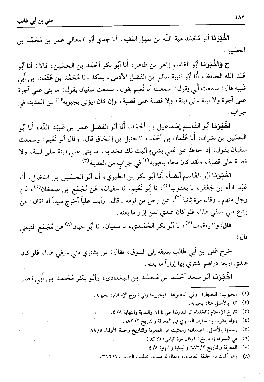 أخبرنا أبو محمد هبة الله بن سهل الفقيه أنا جدي أبو المعالي عمر بن محمد بن الحسين ح وأخبرنا أبو القاسم زاهر بن طاهر أنا أبو بكر أحمد بن الحسين قالا أنا أبو عبد الله الحافظ أنا أبو قتيبة سالم بن الفضل الأدمي بمكة نا محمد بن عثمان بن أبي شيبة قال سمعت أبي يقول سمعت أبا نعيم يقول سمعت سفيان يقول ما بنى علي اجرة على اجرة ولا لبنة على لبنة ولا قصبة على قصبة وإن كان ليؤتى بجبوبه (1) من المدينة في جراب أخبرنا أبو القاسم أسماعيل بن أحمد أنا أبو الفضل عمر بن عبيد الله أنا أبو الحسين بن بشران أنا عثمان بن أحمد بن حنبل بن أسحاق قال وقال أبو نعيم وسمعت سفيان يقول إذا جاءك عن علي بشئ أثبت لك فخذ به ما بنى علي لبنة على لبنة ولا قصبة على قصبة ولقد كان يجاء بحبوبه (2) في جراب من المدينة (3) أخبرنا أبو القاسم أيضا أنا أبو بكر بن الطبري أنا أبو الحسين بن الفضل أنا عبد الله بن جعفر نا يعقوب (4) نا أبو نعيم نا سفينان عن مجمع بن صمغان (5) عن رجل منهم وقال مرة ثانية (6) عن رجل من قومه قال رأيت عليا أخرج سيفا له فقال من يبتاع مني سيفي هذا فلو كان عندي ثمن إزار ما بعته قال ونا يعقوب (7) نا أبو بكر الحميدي نا سفيان نا أبو حيان (8) عن مجمع التيمي قال خرج علي بن أبي طالب بسيفه إلى السوق فقال من يشتري مني سيفي هذا فلو كان عندي أربعة دراهم اشتري بها إزارا ما بعته أخبرنا أبو سعد أحمد بن محمد بن البغدادي وأبو بكر محمد بن أبي نصر