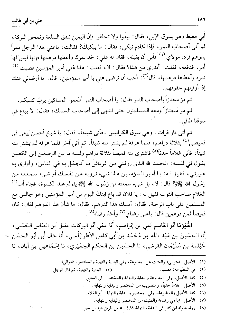 أبي معيط وهو يسوق الإبل فقال بيعوا ولا تحلفوا فإن اليمين تنفق السلعة وتمحق البركة ثم أتى أصحاب التمر فإذا خادم تبكي فقال ما يبكيك فقالت باعني هذا الرجل تمرا بدرهم فرده مولاي (1) فأبى أن يقبله فقال له علي خذ تمرك وأعطها درهمها فإنها ليس لها أمر فدفعه فقلت أتدري من هذا فقال لا فقلت هذا علي أمير المؤمنين فصبت (2) تمره وأعطاها درهمها قال أحب (3) أن ترضى عني يا أمير المؤمنين قال ما أرضاني عنك إذا أوفيتهم حقوقهم ثم مر مجتازا بأصحاب التمر فقال يا أصحاب التمر أطعموا المساكين يرب كسبكم ثم مر مجتازا ومعه المسلمون حتى انتهى إلى أصحاب السمك فقال لا يباع في سوقنا طافي ثم أتى دار فرات وهي سوق الكرابيس فأتى شيخا فقال يا شيخ أحسن بيعي في قميصي (4) بثلاثة دراهم فلما عرفه لم يشتر منه شيئا ثم أتى اخر فلما عرفه لم يشتر منه شيئا فأتى غلاما حدثا (5) فاشترى منه قميصا بثلاثة دراهم ولبسه ما بين الرصغين إلى الكعبين يقول في لبسه الحمد لله الذي رزقني من الرياش ما أتجمل به في الناس وأواري به عورتي فقيل له يا أمير المؤمنين هذا شئ ترويه عن نفسك أو شئ سمعته من رسول الله (صلى الله عليه وسلم) قال لا بل شئ سمعته من رسول الله (صلى الله عليه وسلم) يقوله عند الكسوة فجاء أب (6) الغلام صاحب الثوب فقيل له يا فلان قد باع ابنك اليوم من أمير المؤمنين وهو جالس مع المسلمين على باب الرحبة فقال أمسك هذا الدرهم فقال ما شأن هذا الدرهم فقال كان قميصا ثمن درهمين قال باعني رضاي (7) وأخذ رضاه (8) أخبرنا أبو القاسم علي بن إبراهيم أنا عمي أبو البركات عقيل بن العباس الحسني أنا الحسين بن عبد الله بن محمد بن أبي كامل الأطرابلسي أنا خال أبي أبو الحسن خيثمة بن سليمان القرشي نا الحسين بن الحكم الحميري نا إسماعيل بن أبان نا