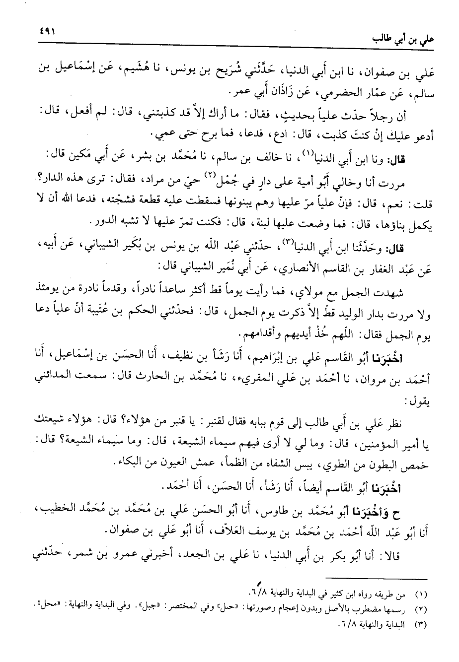 علي بن صفوان نا ابن أبي الدنيا حدثني شريح بن يونس نا هشيم عن إسماعيل بن سالم عن عمار الحضرمي عن زاذان أبي عمر أن رجلا حدث عليا بحديث فقال ما أراك إلا قد كذبتني قال لم أفعل قال أدعو عليك إن كنت كذبت قال ادع فدعا فما برح حتى عمي قال ونا ابن أبي الدنيا (1) نا خالف بن سالم نا محمد بن بشر عن أبي مكين قال مررت أنا وخالي أبو أمية على دار في جمل (2) حي من مراد فقال ترى هذه الدار قلت نعم قال فإن عليا مر عليها وهم يبنونها فسقطت عليه قطعة فشجته فدعا الله أن لا يكمل بناؤها قال فما وضعت عليها لبنة قال فكنت تمر عليها لا تشبه الدور قال وحدثنا ابن أبي الدنيا (3) حدثني عبد الله بن يونس بن بكير الشيباني عن أبيه عن عبد الغفار بن القاسم الأنصاري عن أبي نمير الشيباني قال شهدت الجمل مع مولاي فما رأيت يوما قط أكثر ساعدا نادرا وقدما نادرة من يومئذ ولا مررت بدار الوليد قط إلا ذكرت يوم الجمل قال فحدثني الحكم بن عتيبة أن عليا دعا يوم الجمل فقال اللهم خذ أيديهم وأقدامهم أخبرنا أبو القاسم علي بن إبراهيم أنا رشأ بن نظيف أنا الحسن بن إسماعيل أنا أحمد بن مروان نا أحمد بن علي المقري نا محمد بن الحارث قال سمعت المدائني يقول نظر علي بن أبي طالب إلى قوم ببابه فقال لقنبر يا قنبر من هؤلاء قال هؤلاء شيعتك يا أمير المؤمنين قال وما لي لا أرى فيهم سيماء الشيعة قال وما سيماء الشيعة قال خمص البطون من الطوى يبس الشفاه من الظمأ عمش العيون من البكاء أخبرنا أبو القاسم أيضا أنا رشأ أنا الحسن أنا أحمد ح وأخبرنا أبو محمد بن طاوس أنا أبو الحسن علي بن محمد بن محمد الخطيب أنا أبو عبد الله أحمد بن محمد بن يوسف العلاف أنا أبو علي بن صفوان قالا أنا أبو بكر بن أبي الدنيا نا علي بن الجعد أخبرني عمرو بن شمر حدثني