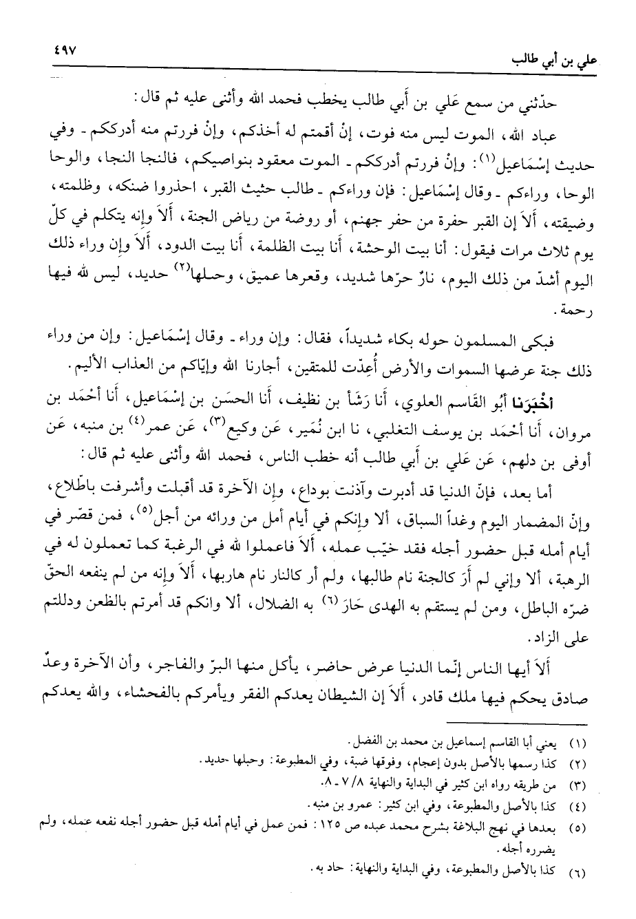 حدثني من سمع علي بن أبي طالب يخطب فحمد الله وأثنى عليه ثم قال عباد الله الموت ليس منه فوت إن أقمتم له أخذكم وإن فررتم منه أدرككم وفي حديث إسماعيل (1) وإن فررتم أدرككم الموت معقود بنواصيكم فالنجا النجا والوحا الوحا وراءكم وقال إسماعيل فإن وراءكم طالب حثيث القبر احذروا ضنكه وظلمته وضيقته ألا إن القبر حفرة من حفر جهنم أو روضة من رياض الجنة ألا وإنه يتكلم في كل يوم ثلاث مرات فيقول أنا بيت الوحشة أنا بيت الظلمة أنا بيت الدود ألا وإن وراء ذلك اليوم أشد من ذلك اليوم نار حرها شديد وقعرها عميق وحلها (2) حديد ليس لله فيها رحمة فبكى المسلمون حوله بكاء شديدا فقال وإن وراء وقال إسماعيل وإن من وراء ذلك جنة عرضها السموات والأرض أعدت للمتقين أجارنا الله وإياكم من العذاب الأليم أخبرنا أبو القاسم العلوي أنا رشأ بن نظيف أنا الحسن بن إسماعيل أنا أحمد بن مروان أنا أحمد بن يوسف التغلبي نا ابن نمير عن وكيع (3) عن عمر (4) بن منبه عن أوفى بن دلهم عن علي بن أبي طالب أنه خطب الناس فحمد الله وإثنى عليه ثم قال أما بعد فإن الدنيا قد أدبرت وآذنت بوداع وإن الاخرة قد أقبلت وأشرفت باطلاع وإن المضمار اليوم وغدا السباق ألا وإنكم في أيام أمل من ورائه من أجل (5) فمن قصر في أيام أمله قبل حضور أجله فقد خيب عمله ألا فاعملوا لله في الرغبة كما تعملون له في الرهبة ألا وأني لم أر كالجنة نام طالبها ولم أر كالنار نام هاربها ألا وأنه من لم ينفعه الحق ضره الباطل ومن لم يستقم به الهدى حار (6) به الضلال ألا وانكم قد أمرتم بالظعن ودللتم على الزاد ألا أيها الناس إنما الدنيا عرض حاضر يأكل منها البر والفاجر وأن الاخرة وعد صادق يحكم فيها ملك قادر ألا إن الشطيان يعدكم الفقر ويأمركم بالفحشاء والله يعدكم