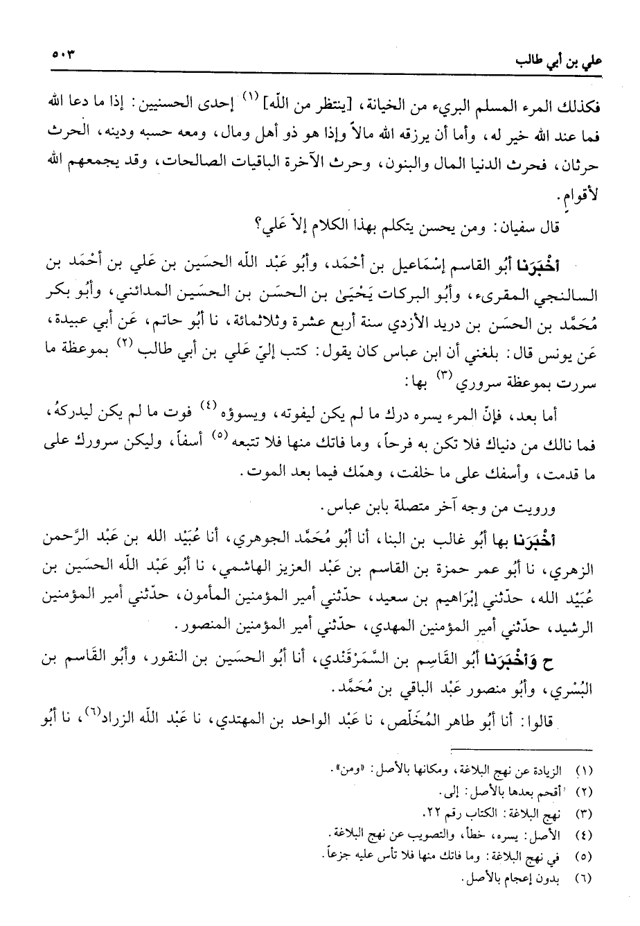 فكذلك المرء المسلم البرئ من الخيانة ينتظر من الله (1) أحدى الحسنيين إذا ما دعا الله فما عند الله خير له وأما أن يرزقه الله مالا وإذا هو ذو أهل ومال ومعه حسبه ودينه الحرث حرثان فحرث الدنيا المال والبنون وحرث الاخرة الباقيات الصالحات وقد يجمعهم الله لأقوام قال سفيان ومن يحسن بتكلم بهذا الكلام إلا علي أخبرنا أبو القاسم أسماعيل بن أحمد وأبو عبد الله الحسين بن علي بن أحمد بن السالنجي المقرئ وأبو البركات يحيى بن الحسن بن الحسين المدائني وأبو بكر محمد بن الحسن بن دريد الأزدي سنة أربع عشرة وثلاثمائة نا أبو حاتم عن أبي عبيدة عن يونس قال بلغني أن ابن عباس كان يقول كتب إلي علي بن أبي طالب (2) بموعظة ما سررت بموعظة سروري (3) بها أما بعد فإن المرء يسره درك ما لم يكن ليفوته ويسوؤه (4) فوت ما لم يكن ليدركه فما نالك من دنياك فلا تكن به فرحا وما فاتك منها فلا تتبعه (5) اسفا وليكن سرورك على ما قد متو أسفك على ما خلفت وهمك فيما بعد الموت ورويت من وجه اخر متصلة بابن عباس أخبرنا بها أبو غالب بن البنا أنا أبو محمد الجوهري أنا عبيد الله بن عبد الرحمن الزهري نا أبو عمر حمزة بن القاسم بن عبد العزيز الهاشمي نا أبو عبد الله الحسين بن عبيد الله حدثني إبراهيم بن سعيد حدثني أمير المؤمنين المأمون حدثني أمير المؤمنين الرشيد حدثني أمير المؤمنين المهدي حدثني أمير المؤمنين المنصور ح وأخبرنا أبو القاسم بن السمرقندي أنا أبو الحسين بن النقور وأبو القاسم بن البسري وأبو منصور عبد الباقي بن محمد قالوا أنا أبو طاهر المخلص نا عبد الواحد بن المهتدي نا عبد الله الزراد (6) نا أبو