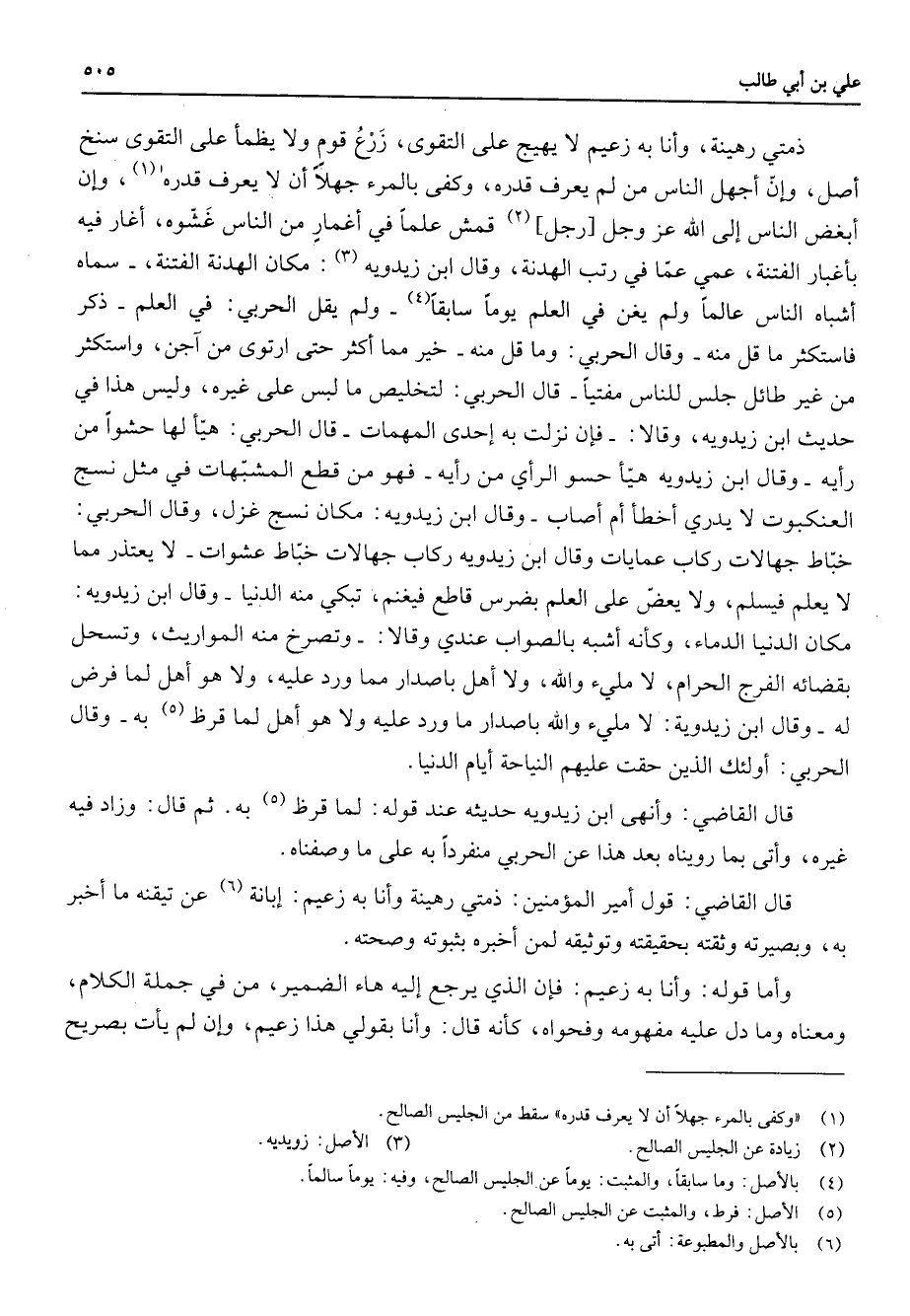 بأغبار الفتنة عمي عما في رتب الهدنة وقال ابن زيدويه (3) مكان الهدنة الفتنة سماه أشباه الناس عالما ولم يغن في العلم يوما سابقا (4) ولم يقل الحربي في العلم ذكر فاستكثر ما قل منه وقال الحربي وما قل منه خير مما أكثر حتى ارتوى من اجن واستكثر من غير طائل جلس للناس مفتيا قال الحربي لتخليص ما لبس على غيره وليس هذا في حديث ابن زيدويه وقالا فإن نزلت به إحدى المهمات قال الحربي هيأ لها حشوا من رأيه وقال ابن زيدويه هيأ حسو الرأي من رأيه فهو من قطع المشبهات في مثل نسج العنكبوت لا يدري أخطا أم أصاب وقال ابن زيدويه مكان نسج غزل وقال الحربي خباط جهالات ركاب عمايات وقال ابن زيدويه ركاب جهالات خباط عشوات لا يعتذر مما يعلم فيسلم ولا يعض على العلم بضرس قاطع فيغنم تبكي منه الدنيا وقال ابن زيدويه مكان الدنيا الدماء وكأنه أشبه بالصواب عندي وقالا وتصرخ منه المواريث وتسحل بقضائه الفرج الحرام لا ملئ والله ولا أهل باصدار مما ورد عليه ولا هو أهل لما فرض له وقال ابن زيدويه لا ملئ والله بإصرار ما ورد عليه ولا هو أهل لما قرظ (5) به وقال الحربي أولئك الذين حقت عليهم النياحة أيام الدنيا قال القاضي وأنهى ابن زيدويه حديثه عند قوله لما قرظ (5) به ثم قال وزاد فيه غيره وأتى بما رويناه بعد هذا عن الحربي منفردا به على ما وصفناه قال القاضي قول أمير المؤمنين ذمتي رهينة وأنا به زعيم إبانة (6) عن تيقنه ما أخبر به وبصيرته وثقته بحقيقته وتوثيقه لمن أخبره بثبوته وصحته وأما قوله وأنا به زعيم فإن الذي يرجع إليه هاء الضمير من في جملة الكلام ومعناه وما دل عليه مفهومه وفحواه كانه قال وأنا بقولي هذا زعيم وإن لم يأت بصريح