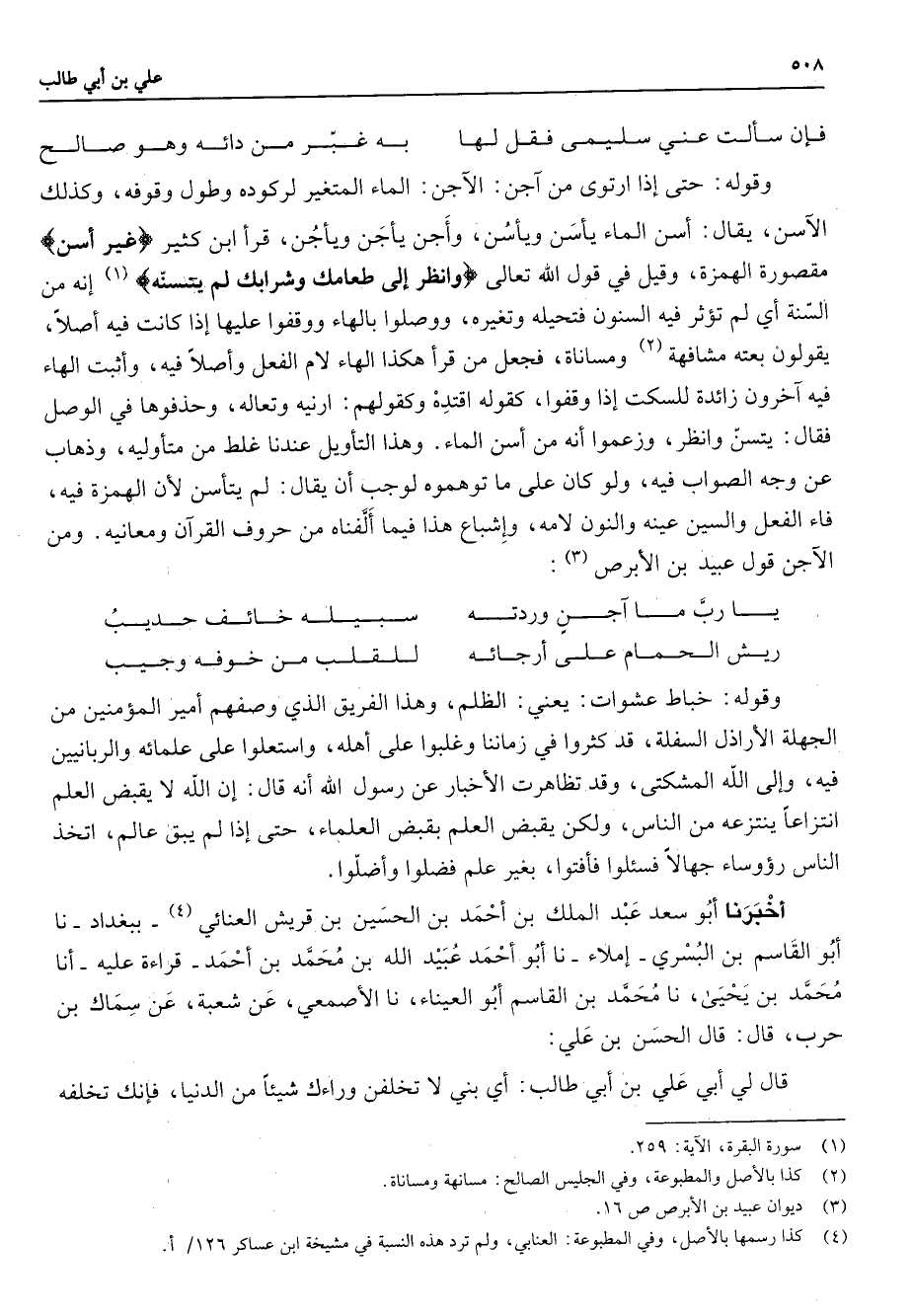 فإن سألت عني سليمى فقل لها * به غبرمن دائه وهو صالح * وقوله حتى إذا ارتوى من آجن الاجن الماء المتغير لركو وطول وقوفه وكذلك الاسن يقال أسن الماء يأسن ويأسن وأجن يأجن ويأجن قرأ ابن كثير " غير أسن " مقصورة الهمزة وقيل في قول الله تعالى " وانظر إلى طعامك وشرابك لم يتسنه " (1) إنه من ألسنة أي لم توثر فيه السنون فتحيله وتغيره ووصلوا بالها ووقفوا عليها إذا كانت فيه أصلا يقولون بعته مشافهه (2) ومساناة فجعل من قرأ هكذ الهاء لام الفعل وأصلا فيه وأثبت الهاء في اخرون زائدة للسكت إذا وقفوا كقوله اقتده وكقولهم ارنيه وتعاله وحذفوها في الوصل فقال يتسن وانظر وزعموا أنه من أسن الماء وهذا التأويل عندنا غلط من متأوليه وذهاب عن وجه الصواب فيه ولو كان على ما توهموا لوجب أن يقال لم يتأسن لأن الهمزة فيه فاء الفعل والسين عينه والنون لامه وإشباع هذا فيما ألفناه من حروف القرآن ومعانيه ومن الاجن قول عيبد بن الأبرص * (3) يا رب ما اجن وردته * سبيله خائف حديب ريش الحمام على أرجائه * للقلب من خوفه وجيب * وقوله خباط عشوات يعني الظلم وهذا الفريق الذي وصفهم أمير المؤمنين من الجهلة الأراذل السفلة قد كثروا في زماننا وغلبوا على أهله واستعلوا على علمائه والربانيين فيه وإلى الله المشكتى وقد تظاهرت الأخبار عن رسول الله أنه قال إن الله لا يقبض العلم انتزاعا ينتزعه من الناس ولكن يقبض العلم بقبض العلماء حتى إذا لم يبق عالم اتخذ الناس رؤوساء جهالا فسئلوا فأفتوا بغير علم فضلوا وأضلوا أخبرنا أبو سعد عبد الملك بن أحمد بن الحسين بن قريش العنائي (4) ببغداد نا أبو القاسم بن البسري إملاء نا أبو أحمد عبيد الله بن محمد بن أحمد قراءة عليه أنا محمد بن يحيى نا محمد بن القاسم أبو العيناء نا الأصمعي عن شعبة عن سماك بن حرب قال قال الحسن بن علي قال لي علي بن أبي طالب أي بني لا تخلفن وراءك شيئا من الدنيا فإنك تخلفه