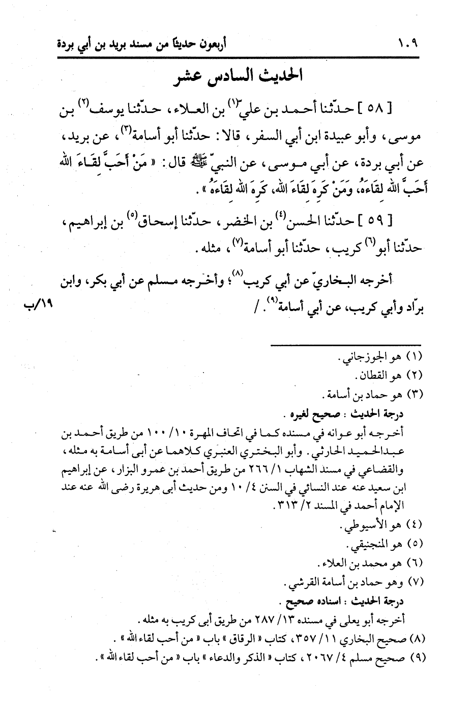 58- حَدَّثَنا أَحْمَدُ بْنُ عَلِيِّ بْنِ الْعَلاءِ، حَدَّثَنا يُوسُفُ بْنُ مُوسَى، وَأَبو عُبَيدة ابن أَبِي السَّفَر، قَالا: حَدَّثَنا أَبُو أُسَامة، عَن بُرَيد، عَن أَبِي بُرْدَة، عَن أَبِي مُوسَى، عَن النَّبِيّ صَلَّى اللَّهُ عَلَيه وَسَلَّم قَالَ: مَنْ أَحَبَّ لِقَاءَ اللَّهِ أَحَبَّ اللَّهُ لِقَاءَهُ وَمَنْ كَرِهَ لِقَاءَ اللَّهِ كَرِهَ اللَّهُ لِقَاءَهُ.