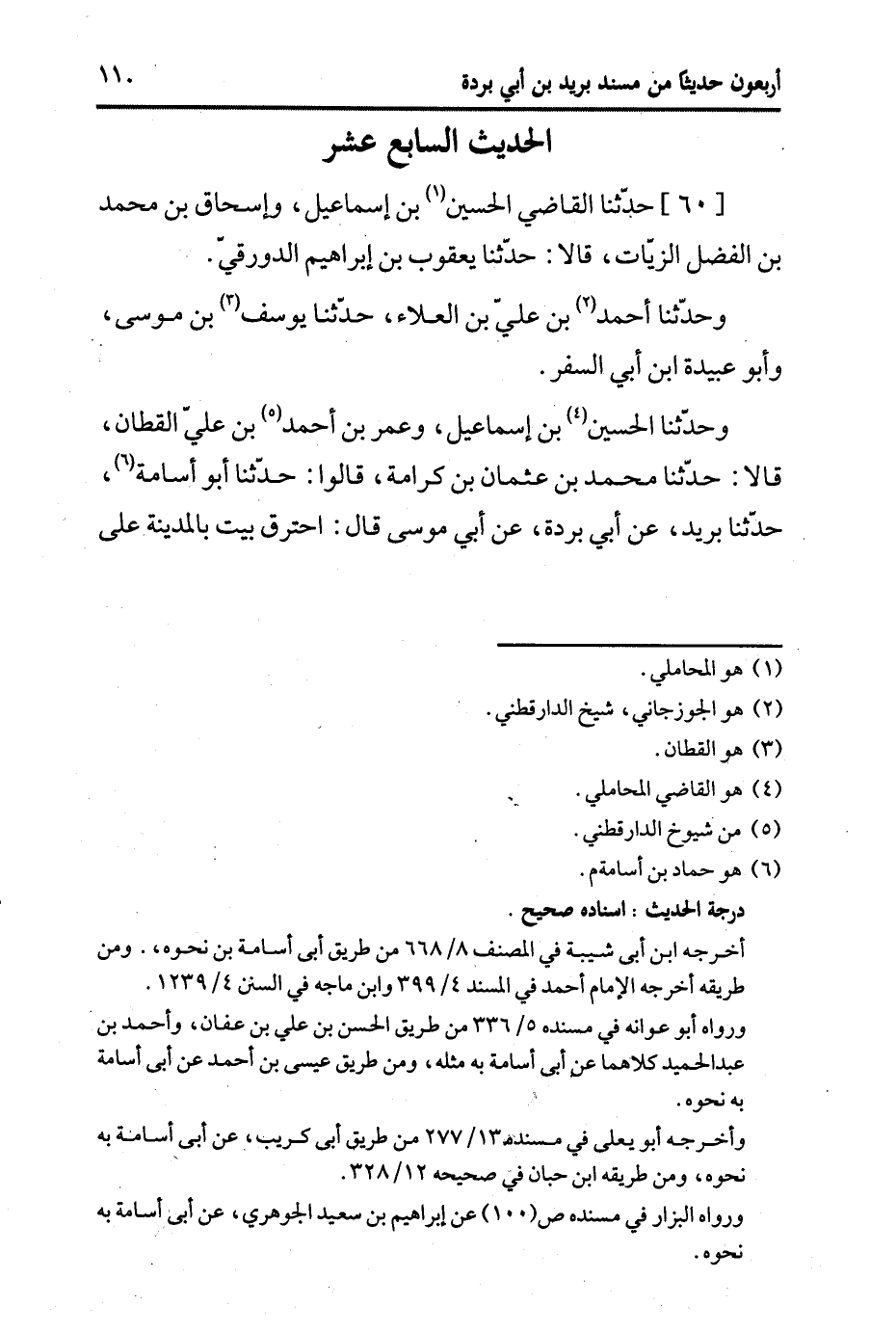 60- حَدَّثَنا الْقَاضِي الْحُسَيْنُ بْنُ إِسْمَاعِيلَ، وَإسحاق بْن مُحَمَّدِ بْنِ الْفَضْلِ الزَّيَّاتُ، قَالا: حَدَّثَنا يَعْقُوبُ بْنُ إِبْرَاهِيمَ الدَّوْرَقِيُّ. وَحَدَّثَنا أَحْمَدُ بْنُ عَلِيِّ بْنِ الْعَلاءِ، حَدَّثَنا يُوسُفُ بْنُ مُوسَى، وَأَبو عُبَيدة ابن أَبِي السَّفَر. وَحَدَّثَنا الْحُسَيْنُ بْنُ إِسْمَاعِيلَ، وعُمَر بْنُ أَحْمَدَ بْنِ عَلِيٍّ الْقَطَّانُ، قَالا: حَدَّثَنا مُحَمَّدُ بْنُ عُثْمَانَ بْنِ كَرَامَةَ، قَالوا: حَدَّثَنا أَبُو أُسَامة، حَدَّثَنا بُرَيد، عَن أَبِي بُرْدَة، عَن أَبِي مُوسَى قَالَ: احْتَرَقَ بَيْتٌ بِالْمَدِينَةِ عَلَى -[111]- أَهْلِهِ بِاللَّيْلِ فَحُدِّثَ النَّبِيُّ صَلَّى اللَّهُ عَلَيه وَسَلَّم بِشَأْنِهِمْ فَقَالَ: إِنَّ هَذِهِ النَّارَ إِنَّمَا هِيَ عَدُوٌّ لَكُمْ فَإِذَا نِمْتُمْ فَأَطْفِئُوهَا عَنْكُمْ.