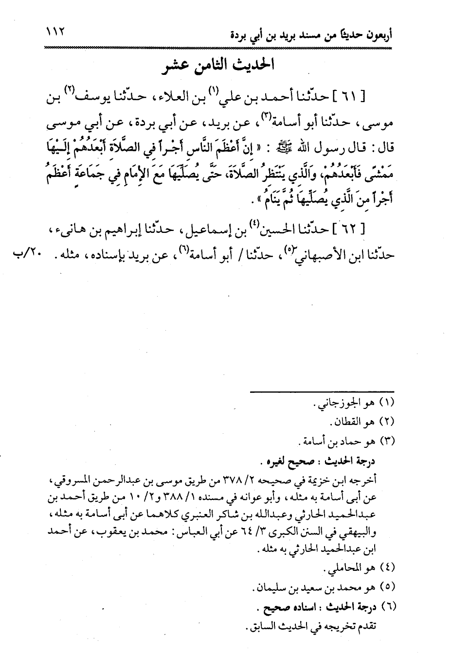 61- حَدَّثَنا أَحْمَدُ بْنُ عَلِيِّ بْنِ الْعَلاءِ، حَدَّثَنا يُوسُفُ بْنُ مُوسَى، حَدَّثَنا أَبُو أُسَامة، عَن بُرَيد، عَن أَبِي بُرْدَة، عَن أَبِي مُوسَى قَالَ: قَالَ رَسُولُ اللَّهِ صَلَّى اللَّهُ عَلَيه وَسَلَّم: إِنَّ أَعْظَمَ النَّاسِ أَجْرًا فِي الصَّلاةِ أَبْعَدُهُمْ إِلَيْهَا مَمْشَى فَأَبْعَدُهُم وَالَّذِي يَنْتَظِرُ الصَّلاةَ حَتَّى يُصَلِّيَهَا مَعَ الإِمَامِ فِي جَمَاعَةٍ أَعْظَمُ أَجْرًا مِنَ الَّذِي يُصَلِّيهَا ثُمَّ يَنَامُ.