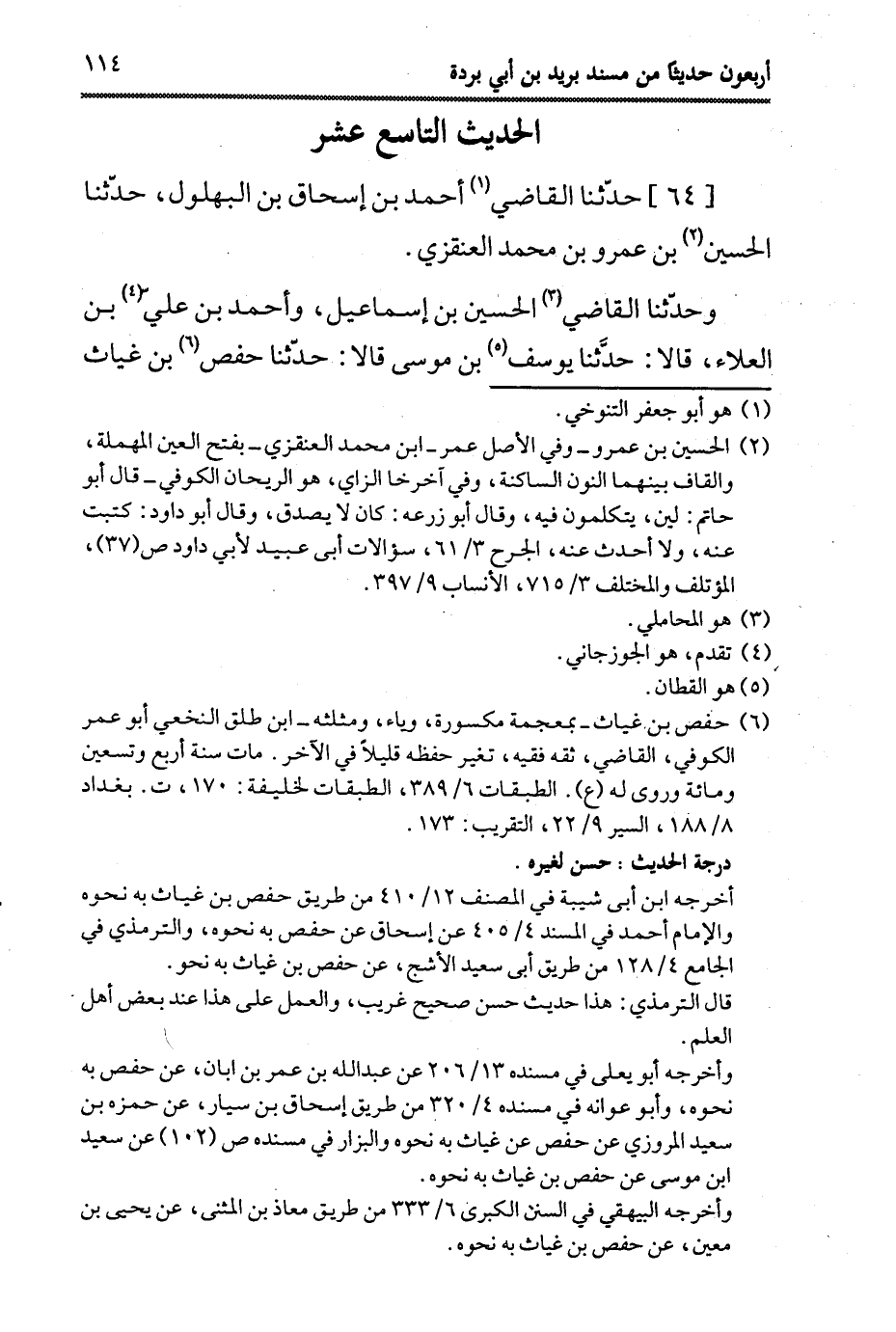 64- حَدَّثَنا الْقَاضِي أَحْمَدُ بْنُ إِسْحَاقَ بْنِ الْبُهْلُولِ، حَدَّثَنا الْحُسَيْنُ بْنُ عَمْرو بْنِ محمد العنقزي (ح) وَحَدَّثَنا الْقَاضِي الْحُسَيْنُ بْنُ إِسْمَاعِيلَ، وَأحمد بْنُ عَلِيِّ بْنِ الْعَلاءِ، قَالا: حَدَّثَنا يُوسُفُ بْنُ مُوسَى، قَالا: حَدَّثَنا حَفْصُ بْنُ غِيَاثٍ -[115]- النَّخَعِيُّ، حَدَّثَنا بُرَيد بْنُ عَبد اللهِ ابن أَبِي بُرْدَة، عَن أَبِي بُرْدَة بْنِ أَبِي مُوسَى، عَن أَبيهِ قَالَ: قَدِمْنَا عَلَى رَسُولِ اللَّهِ صَلَّى اللَّهُ عَلَيه وَسَلَّم وَقَدِ افْتَتَحَ خَيْبَرَ فَقَدِمْنَا بَعْدَ مَا افْتَتَحَهَا بِثَلاثٍ أَسْهَمَ لَنَا وَلَمْ يُسْهِمْ لِغَيْرِنَا مِمَّنْ لَمْ يَشْهَدِ الْفَتْحَ، وَقال ابْنُ بُهْلُولٍ: قَدِمْتُ عَلَى رَسُولِ اللَّهِ صَلَّى اللَّهُ عَلَيه وَسَلَّم بَعْدَ فَتْحِ خَيْبَرَ بِثَلاثٍ فَأَسْهَمَ لَنَا وَلَمْ يُسْهِمْ لأَحَدٍ لَمْ يَشْهَدِ الْفَتْحَ غَيْرُنَا.