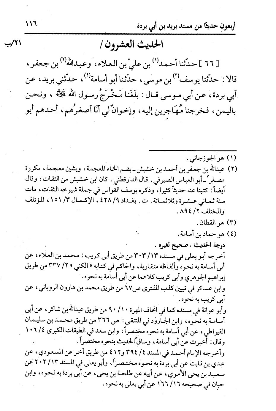 66- حَدَّثَنا أَحْمَدُ بْنُ عَلِيِّ بْنِ الْعَلاءِ، وعَبد اللَّهِ بْنُ جَعْفَرٍ، قَالا: حَدَّثَنا يُوسُفُ بْنُ مُوسَى، حَدَّثَنا أَبُو أُسَامة، حَدَّثَني بُرَيد، عَن أَبِي بُرْدَة، عَن أَبِي مُوسَى قَالَ: بَلَغَنَا مَخْرَجُ رَسُولِ اللَّهِ صَلَّى اللَّهُ عَلَيه وَسَلَّم وَنَحْنُ بِالْيَمَنِ فَخَرَجْنَا مُهَاجِرِينَ إِلَيْهِ وَإِخْوَانٌ لِي أَنَا أَصْغَرُهُمْ أَحَدُهُمْ أَبُو -[117]- بُرْدَة وَالآخَرُ أَبُو رُهْمٍ إِمَّا قَالَ: بِضْعٌ وَإِمَّا قَالَ: ثَلاثَةٌ وَخَمْسُونَ، أَو اثْنَانِ وَخَمْسُونَ رَجُلا مِنْ قَوْمِي فَرَكِبْنَا سَفِينَةً فَأَلْقَتْنَا سَفِينَتُنَا إِلَى النَّجَاشِيِّ بِالْحَبَشَةِ فَوَافَقْنَا جَعْفَرَ بْنَ أَبِي طَالِبٍ وَأَصْحَابَهُ عِنْدَهُ فَقَالَ جَعْفَرٌ: إِنَّ رَسُولَ اللَّهِ صَلَّى الله عَلَيه وَسَلَّم بعثنا هاهنا وَأَمَرَنَا بِالإِقَامَةِ فَأَقِيمُوا مَعَنَا قَالَ: فَأَقَمْنَا مَعَهُ حَتَّى قَدِمْنَا جَمِيعًا قَالَ: فَوَافَقْنَا رَسُولَ اللَّهِ صَلَّى اللَّهُ عَلَيه وَسَلَّم حِينَ افْتَتَحَ خَيْبَرَ فَأَسْهَمَ لَنَا، وَقال: أَعْطَانَا مِنْهَا وَمَا قَسَمَ لأَحَدٍ غَابَ عَنْ فَتْحِ خَيْبَرَ مِنْهَا شَيْئًا إِلا لِمَنْ شَهِدَ مَعَهُ إِلا أَصْحَابَ سَفِينَتِنَا مَعَ جَعْفَرٍ وَأَصْحَابِهِ قَسَمَ لَهُمْ مَعَهُمْ قَالَ: فَكَانَ نَاسٌ مِنَ النَّاسِ يَقُولُونَ لَنَا - يَعْنِي لأَهْلِ السَّفِينَةِ - سَبَقْنَاكُمْ بِالْهِجْرَةِ. قَالَ: فَدَخَلَتْ أَسْمَاءُ بِنْتُ عُمَيْسٍ وَهِيَ مِمَّنْ قَدِمَ مَعَنَا عَلَى حَفْصَةَ زَوْجِ النَّبِيِّ صَلَّى اللَّهُ عَلَيه وَسَلَّم زَائِرَةً وَقَدْ -[118]- كَانَتْ هَاجَرَتْ إِلَى النَّجَاشِيِّ فِيمَنْ هَاجَرَ إِلَيْهِ فَدَخَلَ عُمَرُ - رَحِمَهُ اللَّهُ - عَلَى حَفْصَةَ وَأَسْمَاءُ عِنْدَهَا فَقَالَ عُمَرُ حِينَ رَأَى أَسْمَاءَ: مَنْ هَذِهِ؟ قَالَتْ: أَسْمَاءُ بِنْتُ عُمَيْسٍ. قَالَ عُمَرُ: الْحَبَشِيَّةُ هَذِهِ؟ الْبَحْرِيَّةُ هَذِهِ؟