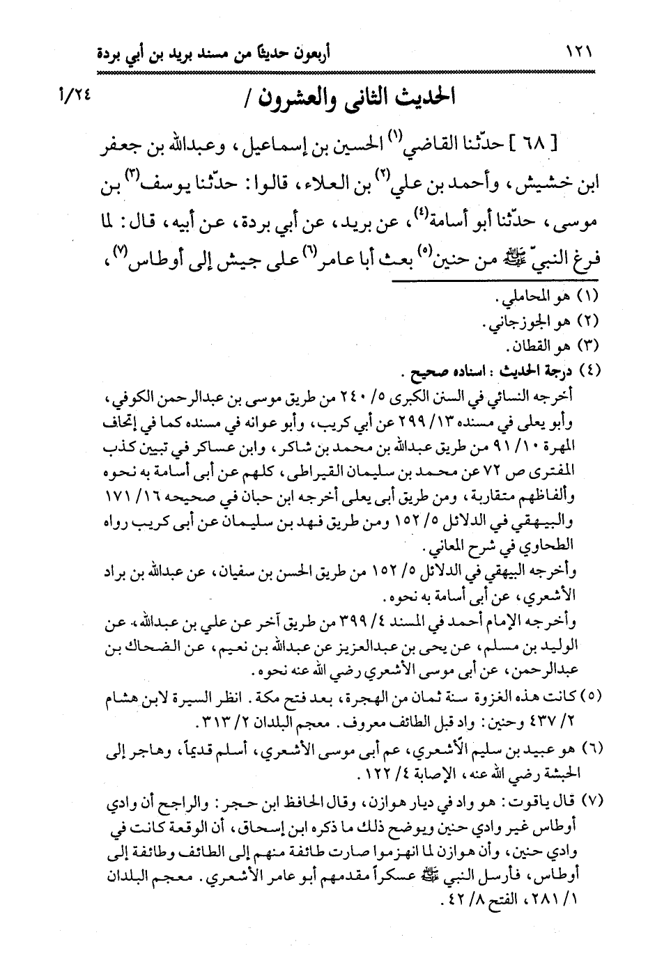 68- حَدَّثَنا الْقَاضِي الْحُسَيْنُ بْنُ إِسْمَاعِيلَ، وعَبد اللَّهِ بْنُ جَعْفَرِ بْنِ خُشَيْشٍ، وَأحمد بْنُ عَلِيِّ بْنِ الْعَلاءِ، قَالوا: حَدَّثَنا يُوسُفُ بْنُ مُوسَى، حَدَّثَنا أَبُو أُسَامة، عَن بُرَيد، عَن أَبِي بُرْدَة، عَن أَبيهِ قَالَ: لَمَّا فَرَغَ النَّبِيُّ صَلَّى اللَّهُ عَلَيه وَسَلَّم مِنْ حُنَيْنٍ بَعَثَ أَبَا عَامِرٍ عَلَى جَيْشٍ إِلَى أَوْطَاسَ -[122]- فَلَقِيَ دُرَيْدَ بْنَ الصِّمَّةِ فَقُتِلَ دُرَيْدٌ وَهَزَمَ اللَّهُ أَصْحَابَهُ قَالَ أَبُو مُوسَى: فَبَعَثَنِي مَعَ أَبِي عَامِرٍ. قَالَ: فَرُمِيَ أَبُو عَامِرٍ فِي رُكْبَتِهِ فَانْتَهَيْتُ إِلَيْهِ فقلت: ياعم! مَنْ رَمَاكَ؟ فَأَشَارَ أَبُو عَامِرٍ إِلَى أَبِي مُوسَى فَقَالَ: إِنَّ ذَاكَ قَاتِلِي تَرَاهُ ذَاكَ الَّذِي رَمَانِي.