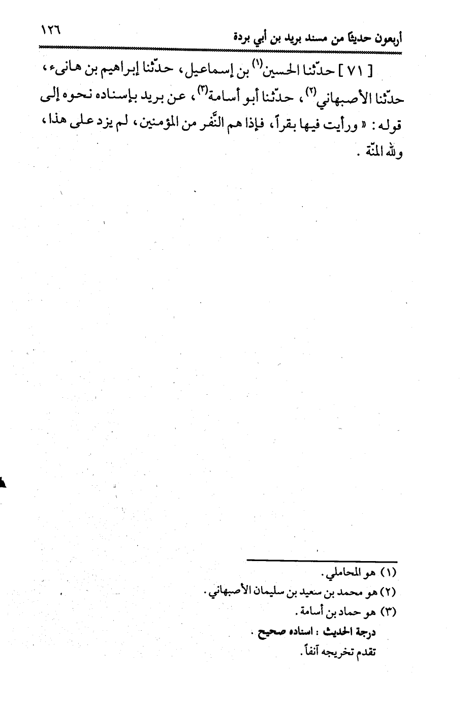 71- حَدَّثَنا الْحُسَيْنُ بْنُ إِسْمَاعِيلَ، حَدَّثَنا إِبْرَاهِيمُ بن هانىء، حَدَّثَنا الأَصْبَهَانِيُّ، حَدَّثَنا أَبُو أُسَامة، عَن بُرَيد، بِإِسْنَادِهِ، نَحْوَهُ إِلَى قَوْلِهِ: وَرَأَيْتُ فِيهَا بَقَرًا فَإِذَا هُمُ النَّفَرُ مِنَ الْمُؤْمِنِينَ لَمْ يَزِدْ عَلَى هَذَا وَلِلَّهِ الْمِنَّةُ.