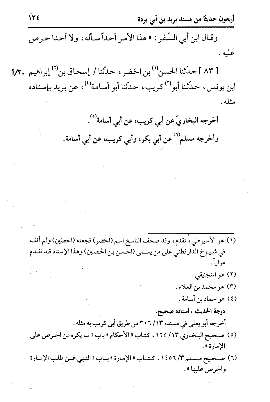 83- حَدَّثَنا الْحَسَنُ بْنُ الْخَضِرِ، حَدَّثَنا إِسْحَاقُ بْنُ إِبْرَاهِيمَ بْنِ يُونُسَ، حَدَّثَنا أَبُو كُرَيب، حَدَّثَنا أَبُو أُسَامة، عَن بُرَيد، بِإِسْنَادِهِ، مِثْلَهُ.