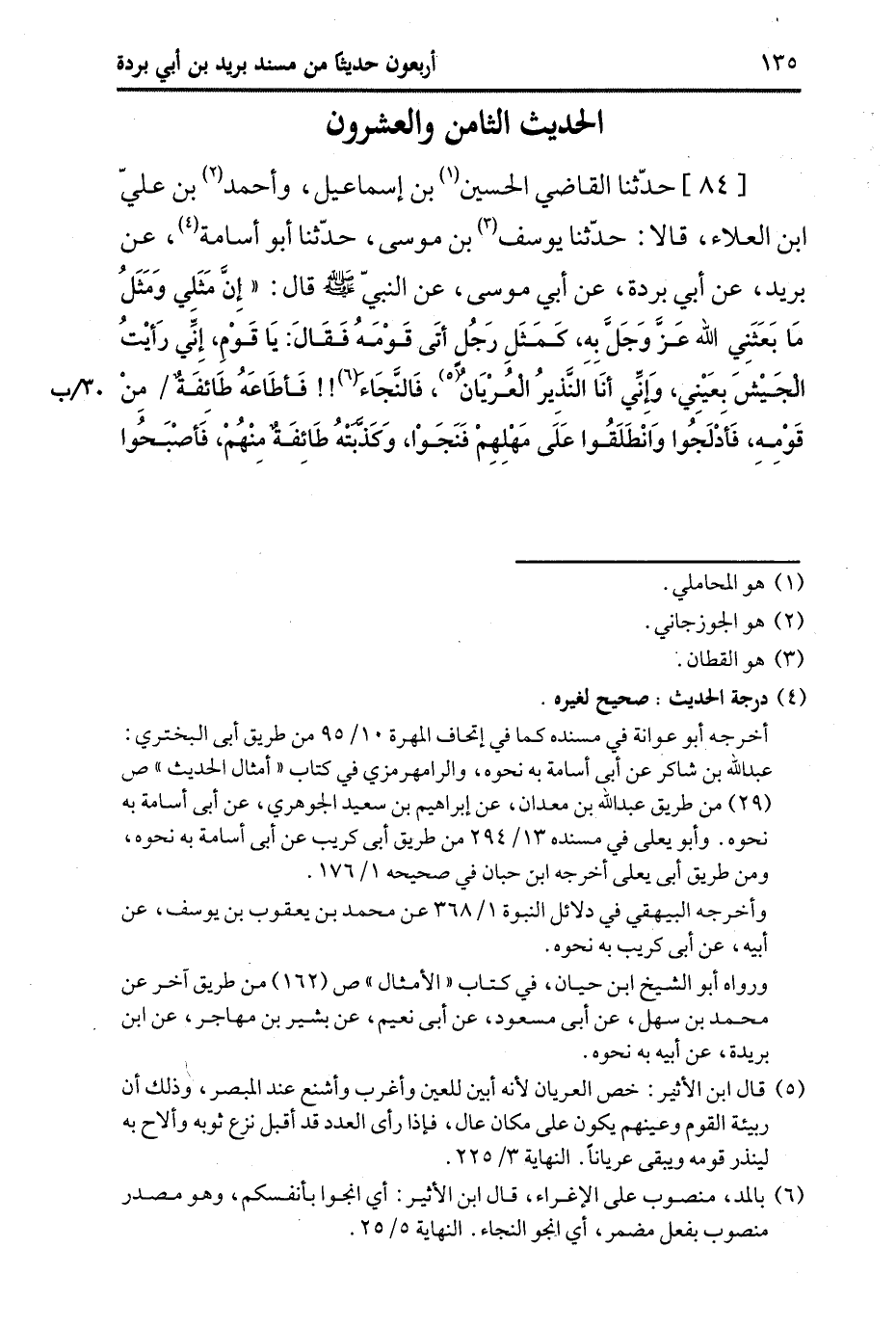 84- حَدَّثَنا الْقَاضِي الْحُسَيْنُ بْنُ إِسْمَاعِيلَ، وَأحمد بْنُ عَلِيِّ بْنِ الْعَلاءِ، قَالا: حَدَّثَنا يُوسُفُ بْنُ مُوسَى، حَدَّثَنا أَبُو أُسَامة، عَن بُرَيد، عَن أَبِي بُرْدَة، عَن أَبِي مُوسَى، عَن النَّبِيّ صَلَّى اللَّهُ عَلَيه وَسَلَّم قَالَ: إِنَّ مَثَلِي وَمَثَلَ مَا بَعَثَنِي اللَّهُ عَزَّ وَجَلَّ بِهِ كَمَثَلِ رَجُلٍ أَتَى قَوْمَهُ فَقَالَ: ياقوم إِنِّي رَأَيْتُ الْجَيْشَ بِعَيْنِي وَإِنِّي أَنَا النَّذِيرُ الْعُرْيَانُ فَالنَّجَاءَ!! فَأَطَاعَهُ طَائِفَةٌ مِنْ قَوْمِهِ فَأَدْلَجُوا وَانْطَلَقُوا عَلَى مَهْلِهِمْ فَنَجَوْا وَكَذَّبَتْهُ طَائِفَةٌ مِنْهُمْ فَأَصْبَحُوا -[136]- مَكَانَهُمْ فَصَبَّحَهُمُ الْجَيْشُ فأَهْلَكَهُمْ وَاجْتَاحَهُمْ فَذَلِكَ مَثَلُ مَنْ أَطَاعَنِي وَاتَّبَعَ مَا جِئْتُ بِهِ وَمَثَلُ مَنْ عَصَانِي وَكَذَّبَ مَا جِئْتُ بِهِ مِنَ الْحَقِّ.