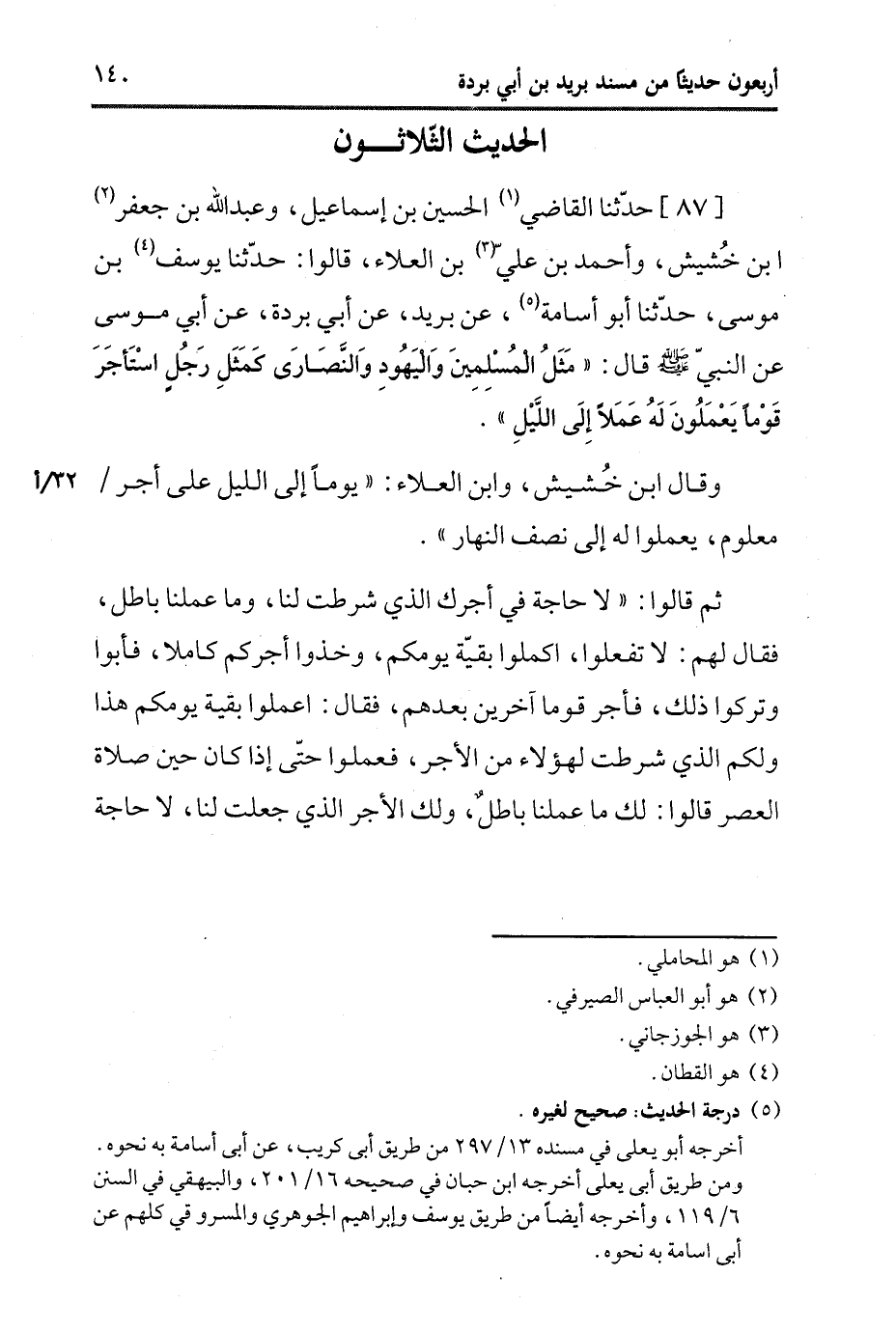 87- حَدَّثَنا الْقَاضِي الْحُسَيْنُ بْنُ إِسْمَاعِيلَ، وعَبد اللَّهِ بْنُ جَعْفَرِ بْنِ خُشَيْشٍ، وَأحمد بْنُ عَلِيِّ بْنِ الْعَلاءِ، قَالوا: حَدَّثَنا يُوسُفُ بْنُ مُوسَى، حَدَّثَنا أَبُو أُسَامة، عَن بُرَيد، عَن أَبِي بُرْدَة، عَن أَبِي مُوسَى، عَن النَّبِيّ صَلَّى اللَّهُ عَلَيه وَسَلَّم قَالَ: مَثَلُ الْمُسْلِمِينَ وَالْيَهُودِ وَالنَّصَارَى كَمَثَلِ رَجُلٍ اسْتَأْجَرَ قَوْمًا يَعْمَلُونَ لَهُ عَمَلًا إِلَى اللَّيْلِ،