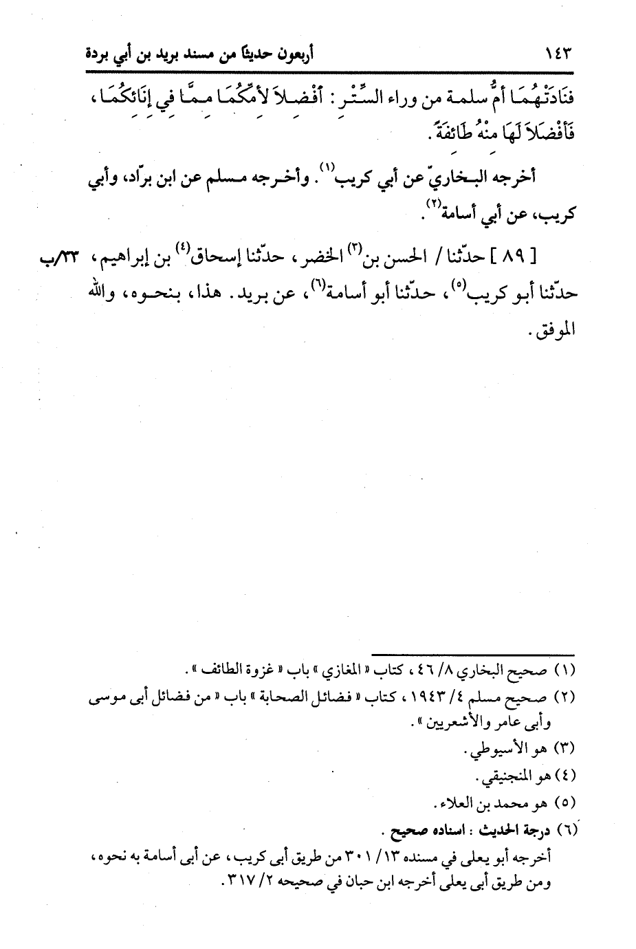 89- حَدَّثَنا الْحَسَنُ بْنُ الْخَضِرِ، حَدَّثَنا إِسْحَاقُ بْنُ إِبْرَاهِيمَ، حَدَّثَنا أَبُو كُرَيب، حَدَّثَنا أَبُو أُسَامة، عَن بُرَيد. هَذَا بِنَحْوِهِ وَاللَّهُ الْمُوَفِّقُ.