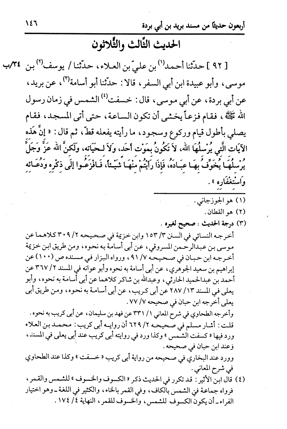 92- حَدَّثَنا أَحْمَدُ بْنُ عَلِيِّ بْنِ الْعَلاءِ، حَدَّثَنا يُوسُفُ بْنُ مُوسَى، وَأَبو عُبَيدة ابن أَبِي السَّفَر، قَالا: حَدَّثَنا أَبُو أُسَامة، عَن بُرَيد، عَن أَبِي بُرْدَة، عَن أَبِي مُوسَى قَالَ: خَسَفَتِ الشَّمْسُ فِي زَمَانِ رَسُولِ اللَّهِ صَلَّى اللَّهُ عَلَيه وَسَلَّم فَقَامَ فَزِعًا يَخْشَى أَن تَكُونَ السَّاعَةُ حَتَّى أَتَى الْمَسْجِدَ فَقَامَ يُصَلِّي بِأَطْوَلِ قِيَامٍ وَرُكُوعٍ وَسُجُودٍ مَا رَأَيْتُهُ يَفْعَلُهُ قَطُّ ثُمَّ قَالَ: إِنَّ هَذِهِ الآيَاتِ الَّتِي يُرْسِلُهَا اللَّهُ لَا تَكُونُ بِمَوْتِ أَحَدٍ، ولاَ لِحَيَاتِهِ وَلَكِنَّ اللَّهَ عَزَّ وَجَلَّ يُرْسِلُهَا يُخَوِّفُ بِهَا عِبَادَهُ فَإِذَا رَأَيْتُمْ مِنْهَا شَيْئًا فَافْزَعُوا إِلَى ذِكْرِهِ وَدُعَائِهِ وَاسْتِغْفَارِهِ.
