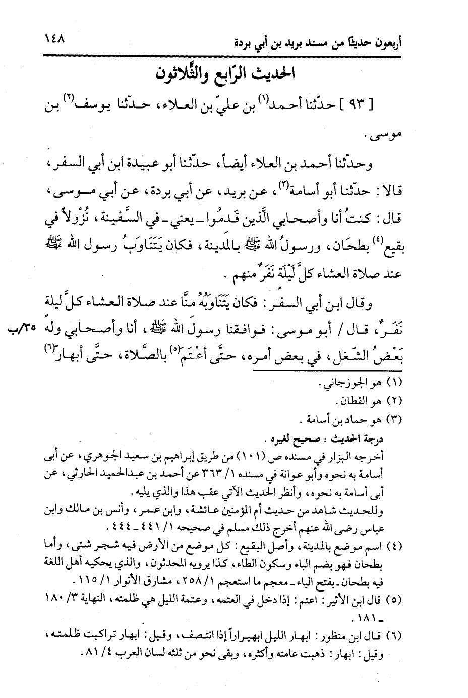 93- حَدَّثَنا أَحْمَدُ بْنُ عَلِيِّ بْنِ الْعَلاءِ، حَدَّثَنا يُوسُفُ بْنُ مُوسَى. وَحَدَّثَنا أَحْمَدُ بْنُ الْعَلاءِ أَيْضًا، حَدَّثَنا أَبُو عُبَيدة ابن أَبِي السَّفَر، قَالا: حَدَّثَنا أَبُو أُسَامة، عَن بُرَيد، عَن أَبِي بُرْدَة، عَن أَبِي مُوسَى قَالَ: كُنْتُ أَنَا وَأَصْحَابِي الَّذِينَ قَدِمُوا، يَعْنِي فِي السَّفِينَةِ نُزُولا فِي بَقِيعِ بَطْحَانَ وَرَسُولُ اللَّهِ صَلَّى اللَّهُ عَلَيه وَسَلَّم بِالْمَدِينَةِ فَكَانَ يَتَنَاوَبُ رَسُولَ اللَّهِ صَلَّى اللَّهُ عَلَيه وَسَلَّم عِنْدَ صَلاةِ الْعِشَاءِ كُلَّ لَيْلَةٍ نَفَرٌ مِنْهُمْ، وَقال ابْنُ أَبِي السَّفَر: فَكَانَ يَتَنَاوَبُهُ مِنَّا عِنْدَ صَلاةِ الْعِشَاءِ كُلَّ لَيْلَةٍ نَفَرٌ قَالَ أَبُو مُوسَى: فَوَافَقْنَا رَسُولَ اللَّهِ صَلَّى اللَّهُ عَلَيه وَسَلَّم أَنَا وَأَصْحَابِي وَلَهُ بَعْضُ الشُّغْلِ فِي بَعْضِ أَمْرِهِ حَتَّى أَعْتَمَ بِالصَّلاةِ حَتَّى ابْهَارَّ -[149]- اللَّيْلُ ثُمَّ خَرَجَ رَسُولُ اللَّهِ صَلَّى اللَّهُ عَلَيه وَسَلَّم فَصَلَّى بِهِمْ فَلَمَّا قَضَى صَلاتَهُ قَالَ لِمَنْ حَضَرَهُ: عَلَى رِسْلِكُمْ أُكَلِّمُكُمْ وَأَبْشِرُوا إِنَّ مِنْ نِعْمَةِ اللَّهِ عَلَيْكُمْ أَنَّهُ لَيْسَ مِنَ النَّاسِ أَحَدٌ يُصَلِّي هَذِهِ الصَّلَاةَ السَّاعَةَ غَيرُكُمْ، أَو قَالَ: مَا صَلَّى هَذِهِ السَّاعَةَ أَحَدٌ غَيْرُكُمْ. لا نَدْرِي أَيَّ الْكِلْمَتَيْنِ قَالَ. قَالَ أَبُو مُوسَى: فَرَجَعْنَا فَرِحِينَ بِمَا سَمِعْنَا مِنْ رَسُولِ اللَّهِ صَلَّى اللَّهُ عَلَيه وَسَلَّم.