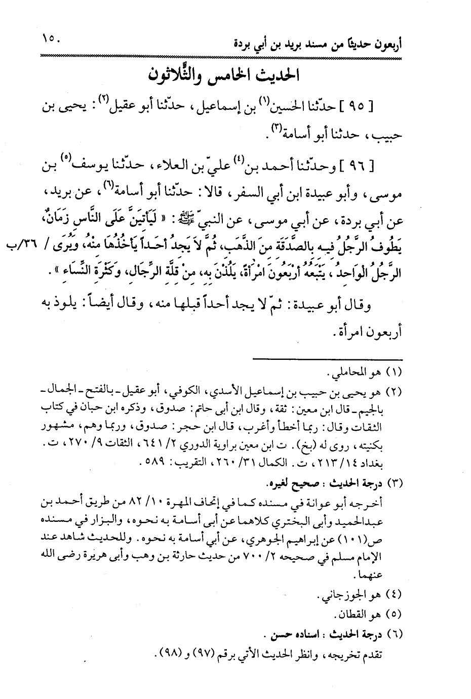 96- وحَدَّثنا أَحْمَدُ بْنُ عَلِيِّ بْنِ الْعَلاءِ، حَدَّثَنا يُوسُفُ بْنُ مُوسَى، وَأَبو عُبَيدة ابن أَبِي السَّفَر، قَالا: حَدَّثَنا أَبُو أُسَامة، عَن بُرَيد، عَن أَبِي بُرْدَة، عَن أَبِي مُوسَى، عَن النَّبِيّ صَلَّى اللَّهُ عَلَيه وَسَلَّم: لَيَأْتِيَنَّ عَلَى النَّاسِ زَمَانٌ يَطُوفُ الرَّجُلُ فِيهِ بِالصَّدَقَةِ مِنَ الذَّهَبِ ثُمَّ لَا يَجِدُ أَحَدًا يَأْخُذُهَا مِنْهُ وَيُرَى الرَّجُلُ الْوَاحِدُ يَتْبَعُهُ أَرْبَعُونَ امْرَأَةً يَلُذْنَ بِهِ مِنْ قِلَّةِ الرِّجَالِ وَكَثْرَةِ النِّسَاءِ، وَقال أَبُو عُبَيدة: ثُمَّ لا يَجِدُ أَحَدًا قَبِلَهَا مِنْهُ، وَقال أَيْضًا: يَلُوذُ بِهِ أَرْبَعُونَ امْرَأَةً.