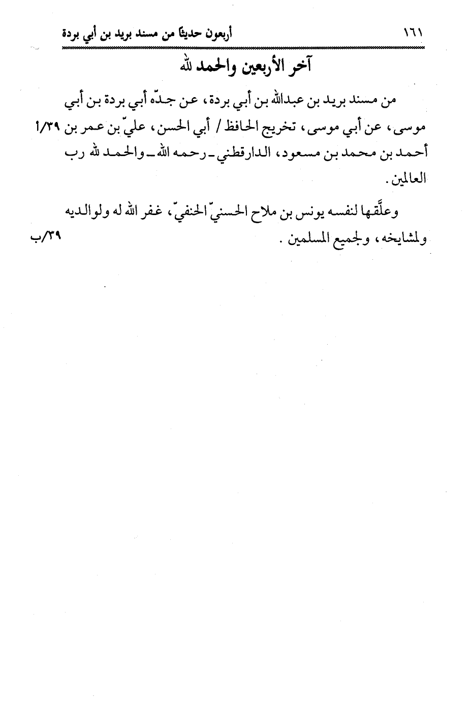 مِنْ مُسْنَدِ بُرَيْدِ بْنِ عَبْدِ اللَّهِ بْنِ أَبِي بُرْدَةَ عَنْ جَدِّهِ أَبِي بُرْدَةَ بْنِ أَبِي مُوسَى، عَنْ أَبِي مُوسَى تَخْرِيجُ الْحَافِظِ أَبِي الْحَسَنِ عَلِيِّ بْنِ عُمَرَ بْنِ أَحْمَدَ بْنِ مُحَمَّدِ بْنِ مَسْعُودٍ، الدَّارَقُطْنِيِّ رَحِمَهُ اللَّهُ وَالْحَمْدُ لِلَّهِ رَبِّ الْعَالَمِينَ.