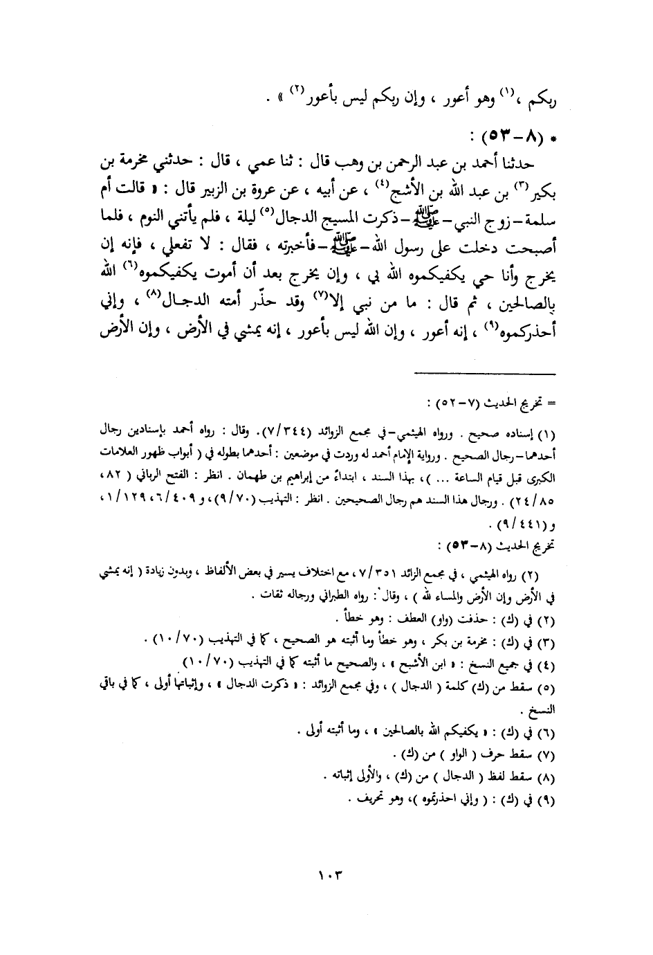 حَدَّثَنَا أَحْمَدُ بْنُ عَبْدِ الرَّحْمَنِ بْنِ وَهْبٍ، قَالَ: ثنا عَمِّي، قَالَ: حَدَّثَنِي مَخْرَمَةُ بْنُ بُكَيْرِ بْنِ عَبْدِ اللَّهِ بْنِ الْأَشَجِّ، عَنْ أَبِيهِ، عَنْ عُرْوَةَ بْنِ الزُّبَيْرِ، قَالَ: قَالَتْ أُمُّ سَلَمَةَ زَوْجُ النَّبِيِّ صَلَّى اللهُ عَلَيْهِ وَسَلَّمَ ذَكَرْتُ الْمَسِيحَ الدَّجَّالَ لَيْلَةً، فَلَمْ يَأْتِنِي النَّوْمُ، فَلَمَّا أَصْبَحْتُ دَخَلْتُ عَلَى رَسُولِ اللَّهِ صَلَّى اللهُ عَلَيْهِ وَسَلَّمَ فَأَخْبَرْتُهُ، فَقَالَ: " لَا تَفْعَلِي، فَإِنَّهُ §إِنْ يَخْرُجْ وَأَنَا حَيٌّ يَكْفِيكُمُوهُ اللَّهُ بِي، وَإِنْ يَخْرُجَ بَعْدَ أَنْ أَمُوتَ يَكْفِيكُمُوهُ اللَّهُ بِالصَّالِحِينَ، ثُمَّ قَالَ: «مَا مِنْ نَبِيٍّ إِلَّا وَقَدْ حَذَّرَ أُمَّتَهُ الدَّجَّالَ، وَإِنِّي أُحَذِّرُكُمُوهُ، إِنَّهُ أَعْوَرُ، وَإِنَّ اللَّهَ لَيْسَ بِأَعْوَرَ، إِنَّهُ يَمْشِي فِي الْأَرْضِ، وَإِنَّ الْأَرْضَ -[104]- وَالسَّمَاءَ لِلَّهِ، إِلَّا أَنَّ الْمَسِيحَ عَيْنَهُ الْيُمْنَى كَأَنَّهَا عِنَبَةٌ طَافِيَةٌ» قَالَ أَبُو بَكْرٍ: هَذَا بَابٌ طَوِيلٌ، خَرَّجْتُهُ فِي كِتَابِ الْفِتَنِ، فِي قِصَّةِ الدَّجَّالِ